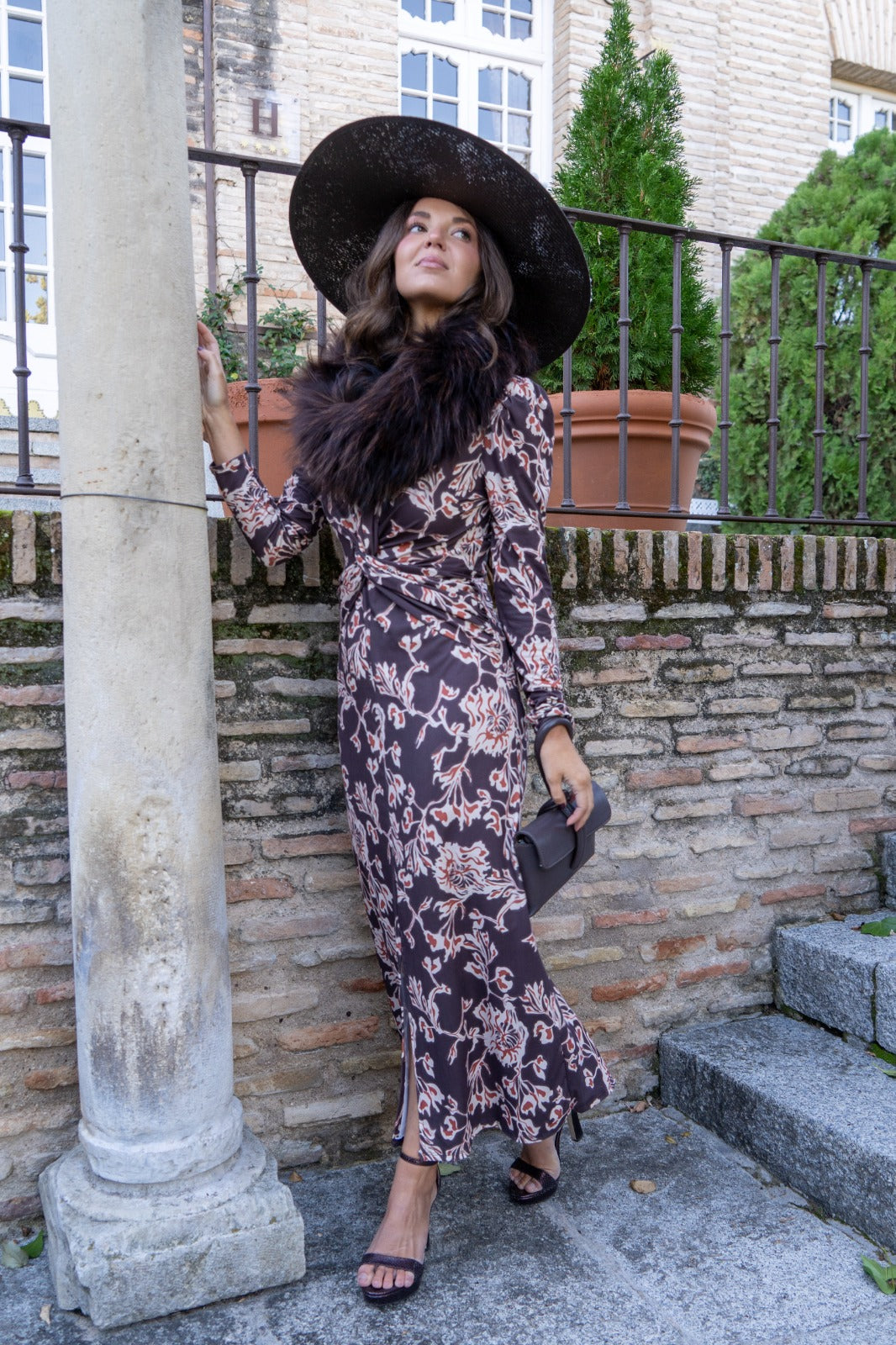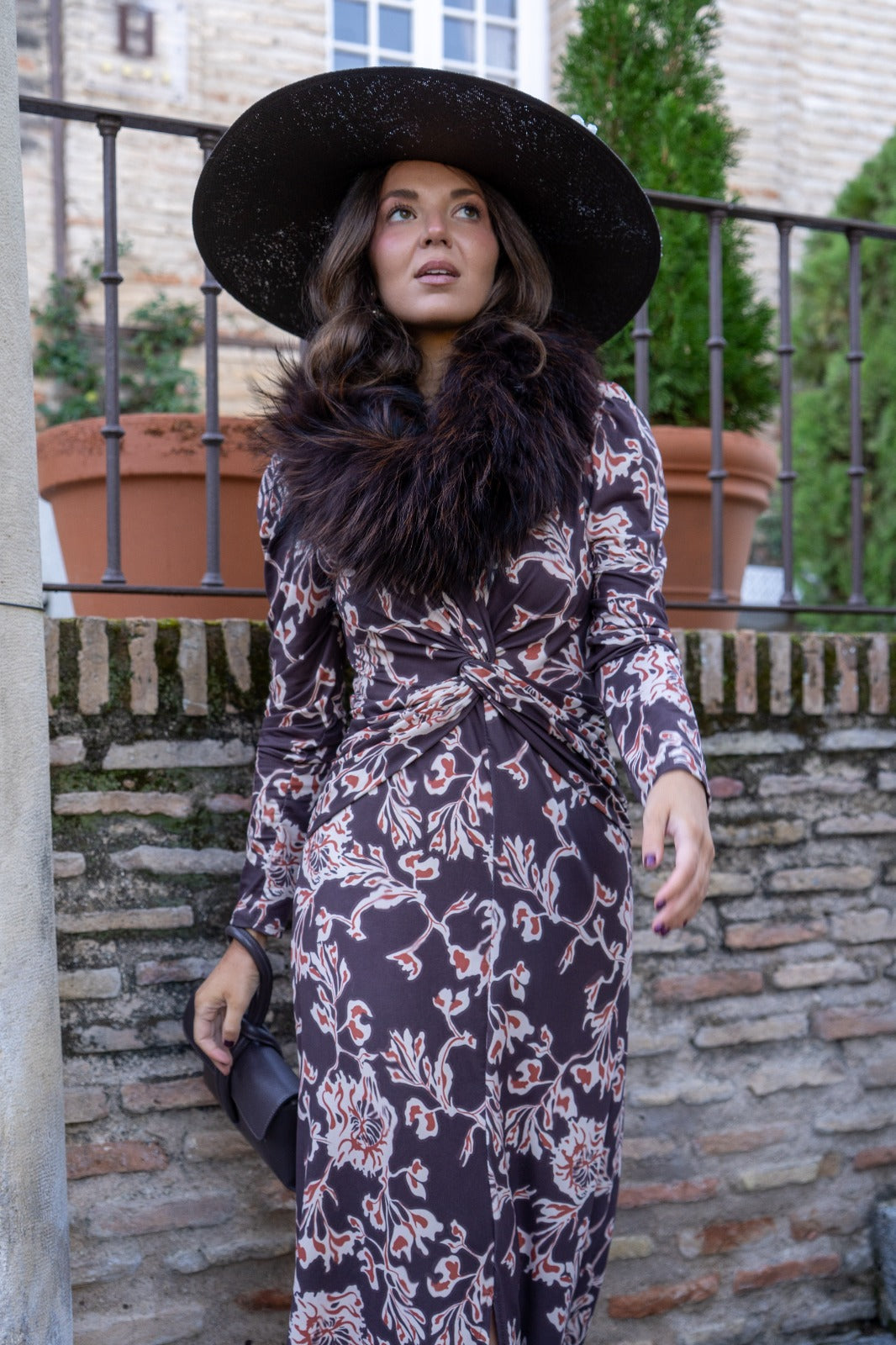 Vestido midi, escote a pico terminado en nudo, corte en cintura, abertura delantera, en color marrón con estampado.