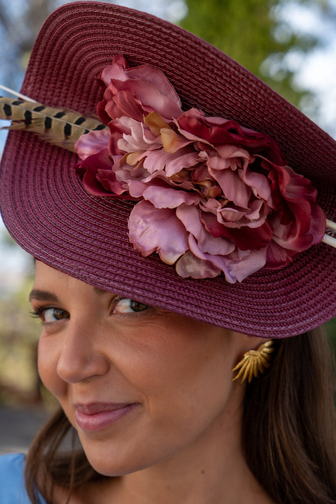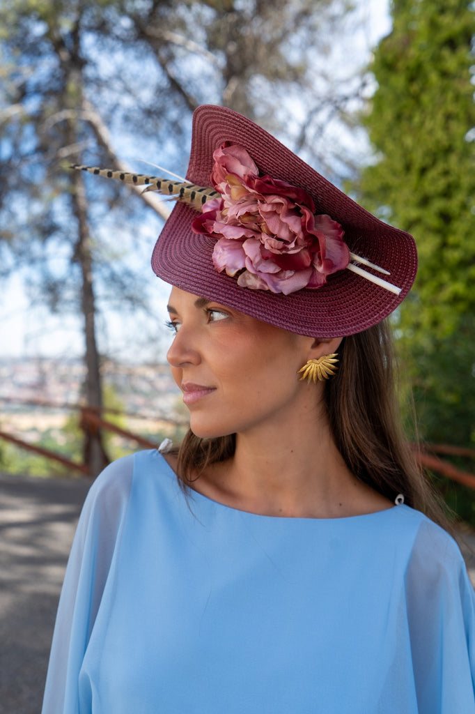 Tocado con base en poliester, con detalle flor y pluma, con diadema para sujeccion, en color burdeos.