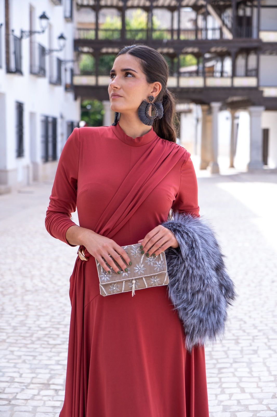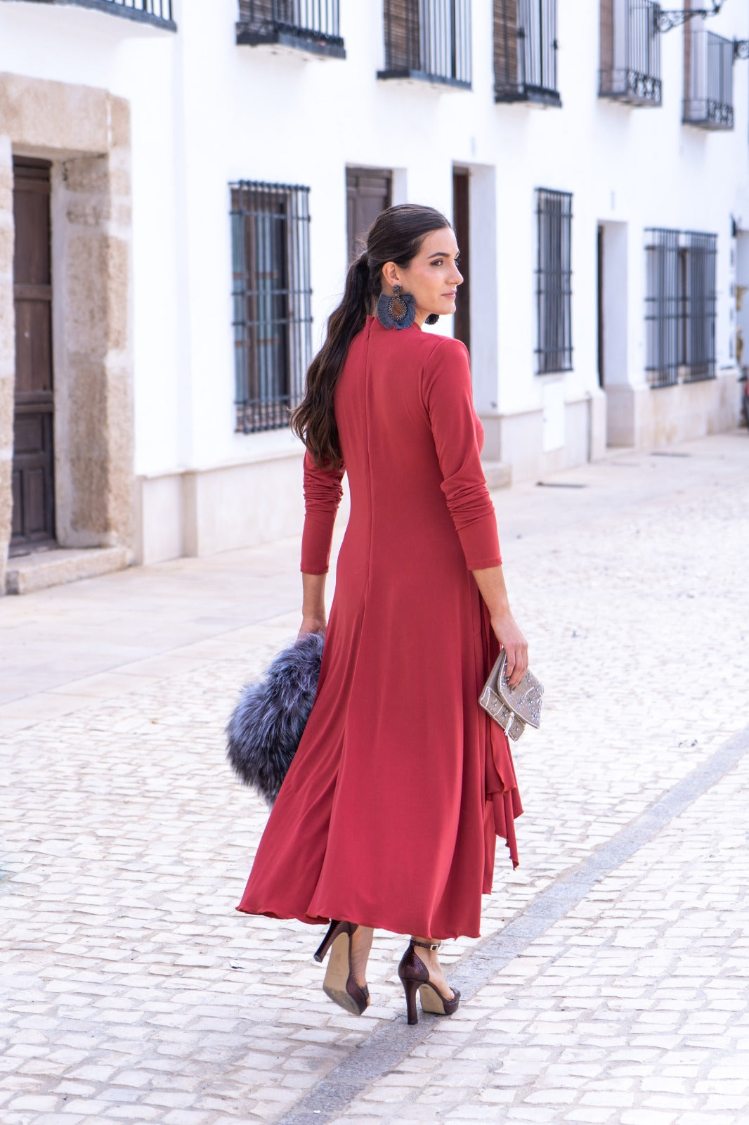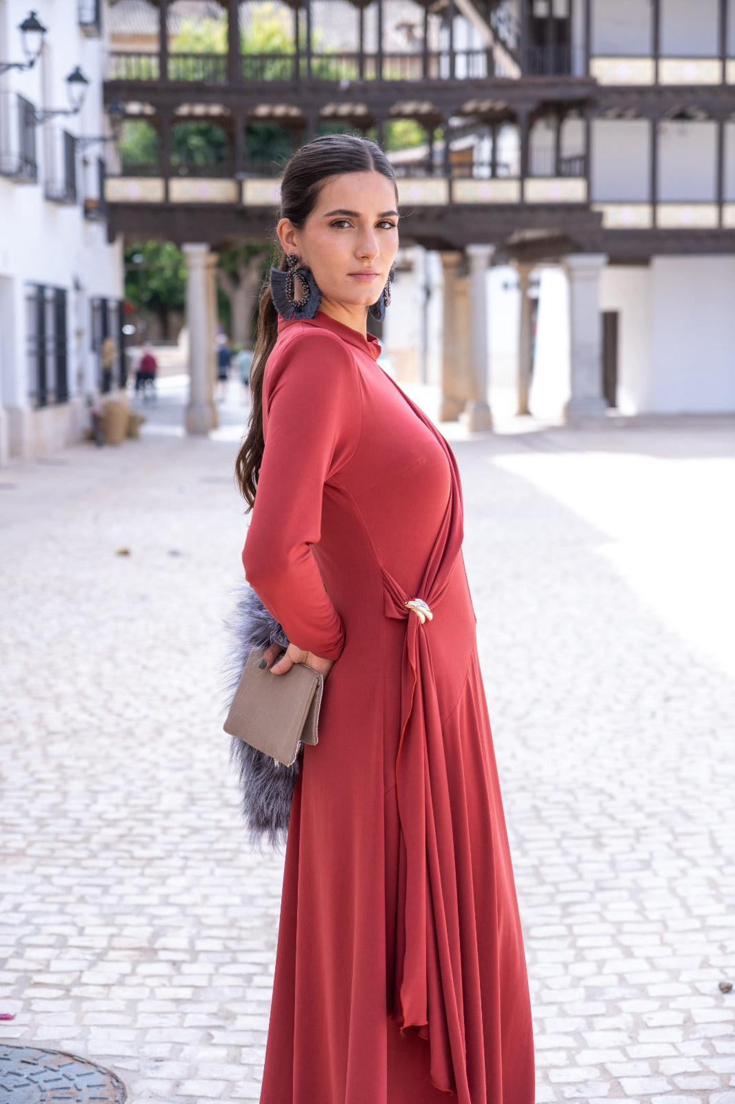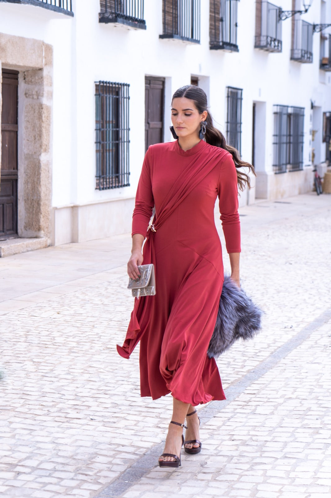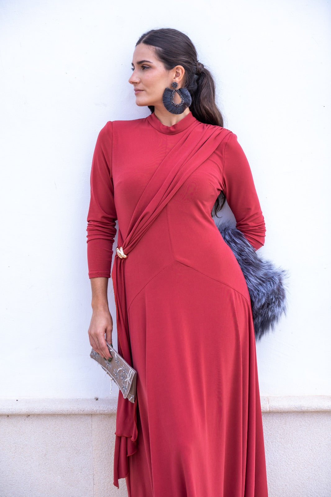 Vestido midi, cuello subido, manga larga, detalle broche aun lado con tira cruzada, falda con movimiento. En punto seda color caldera.