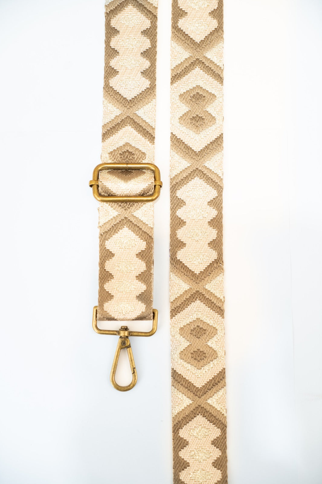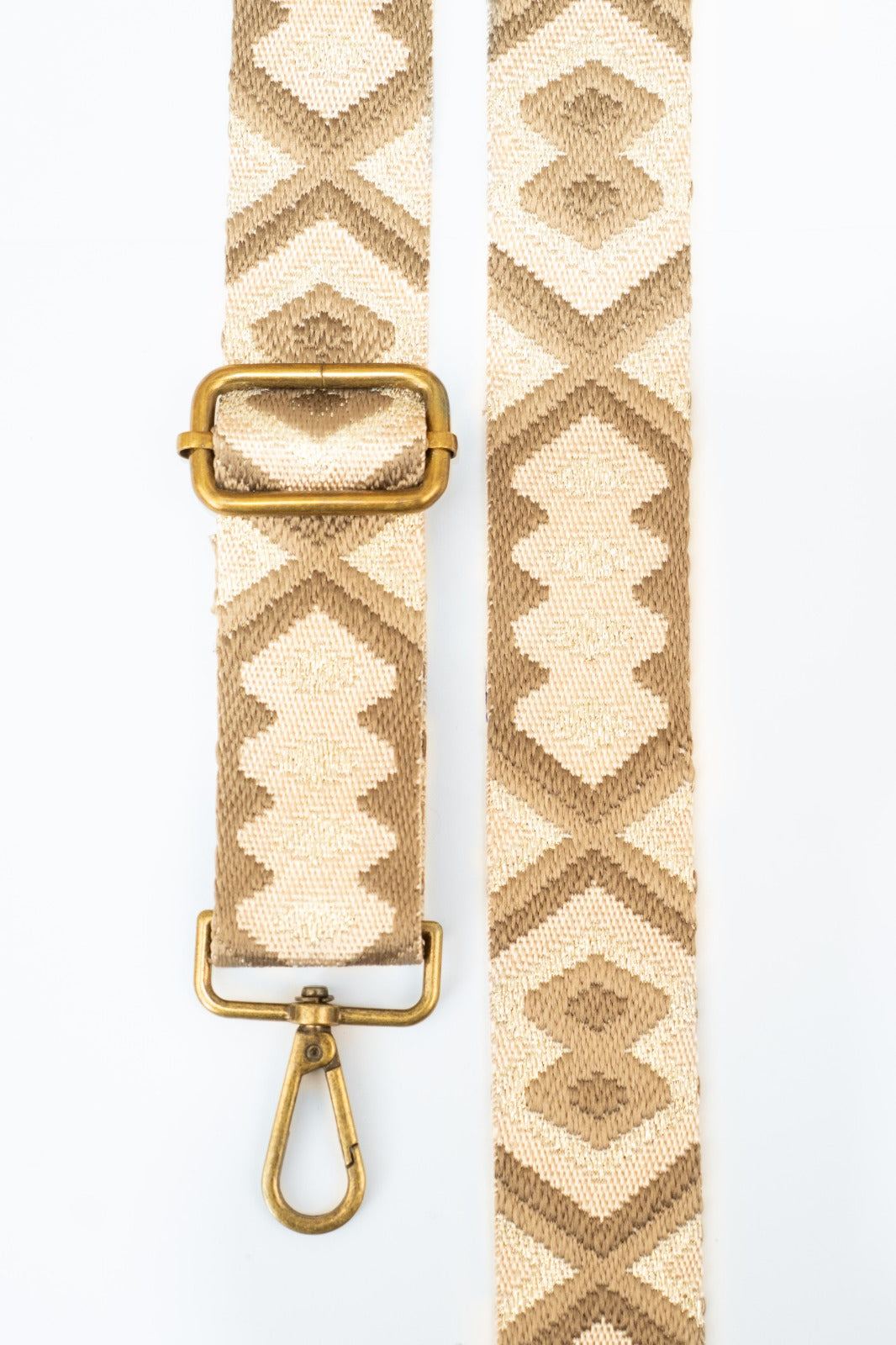 Asa bandolera étnica tejida con diferentes estampados en camel y beige. Combinable con los bolsos Cies y Cotal.