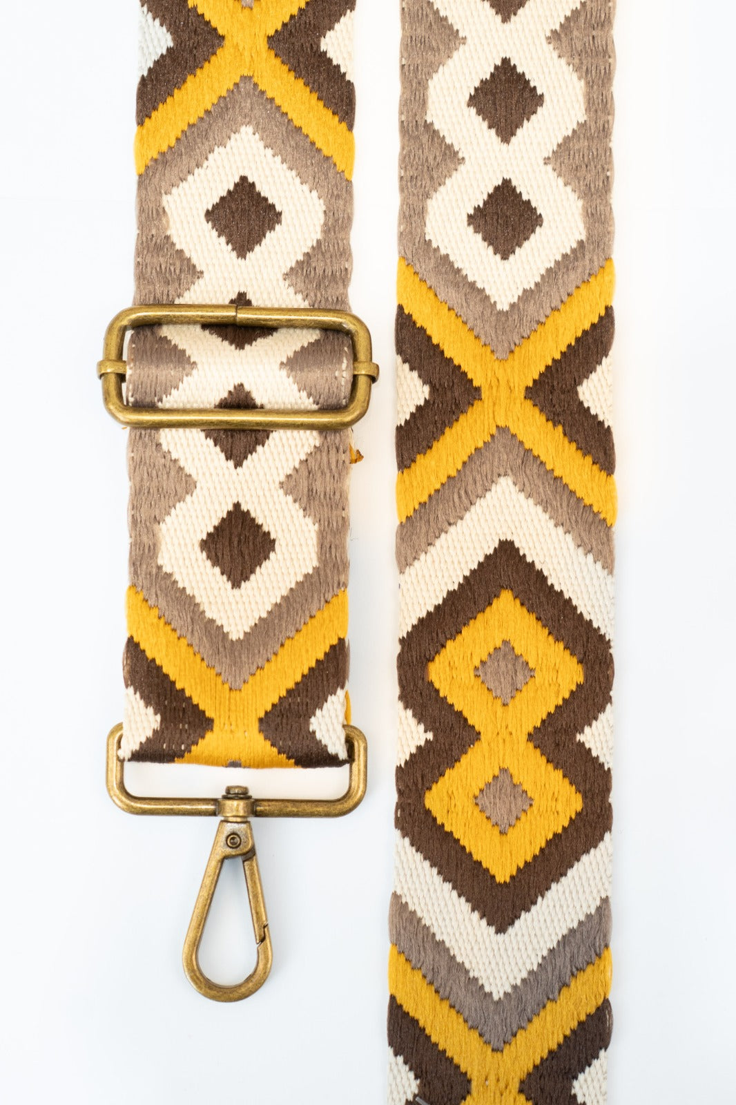 Asa bandolera étnica tejida con diferentes estampados en mostaza y marrón. Combinable con los bolsos Cies y Cotal.