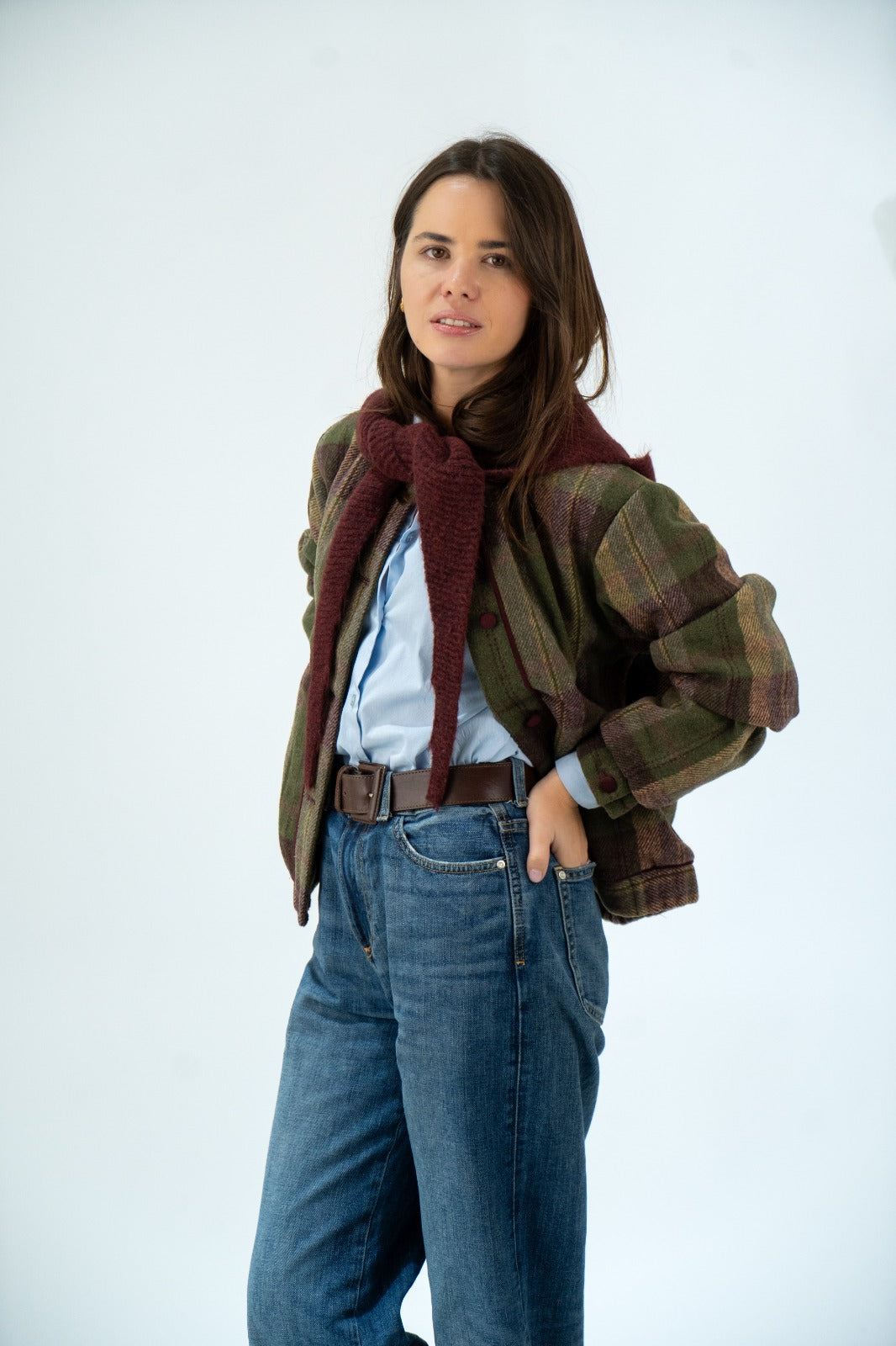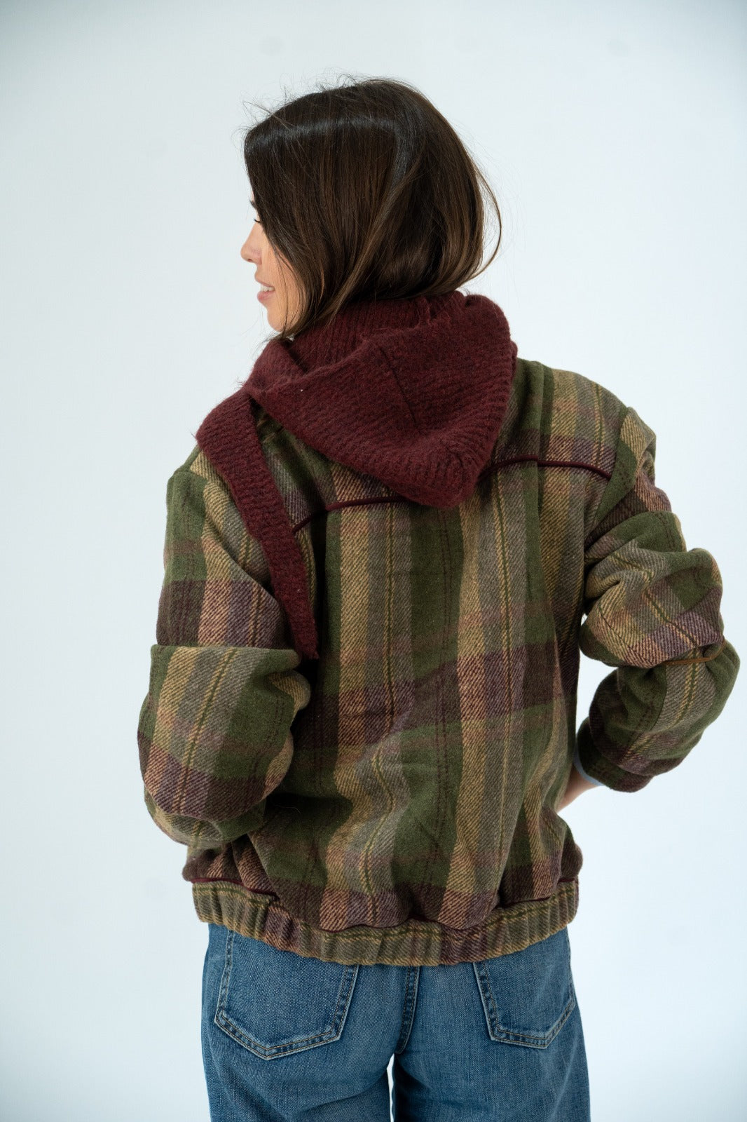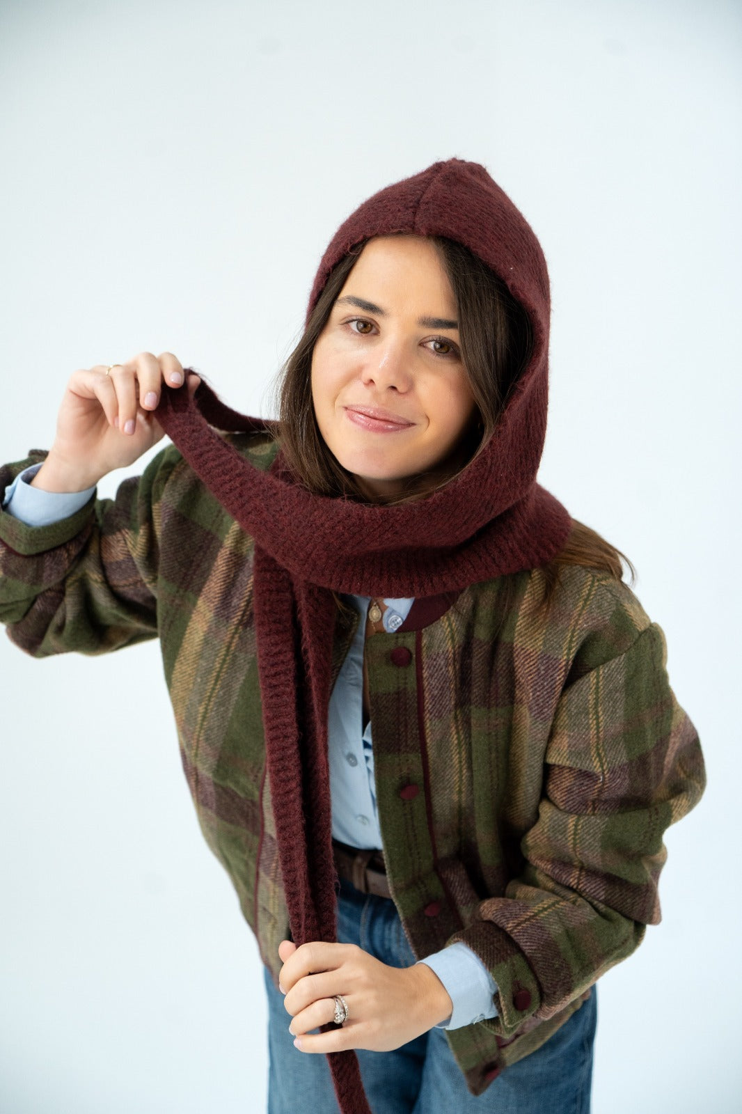 Combinación de bufanda terminada en picos y capucha en lana, en color burdeos.