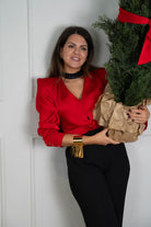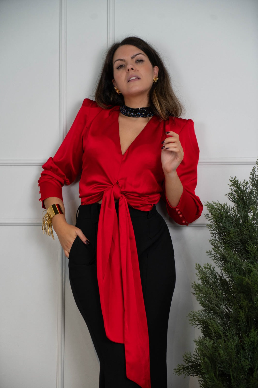 Blusa en saten, escote a pico, manga larga con puño abotonado, anudada delante. En color rojo.