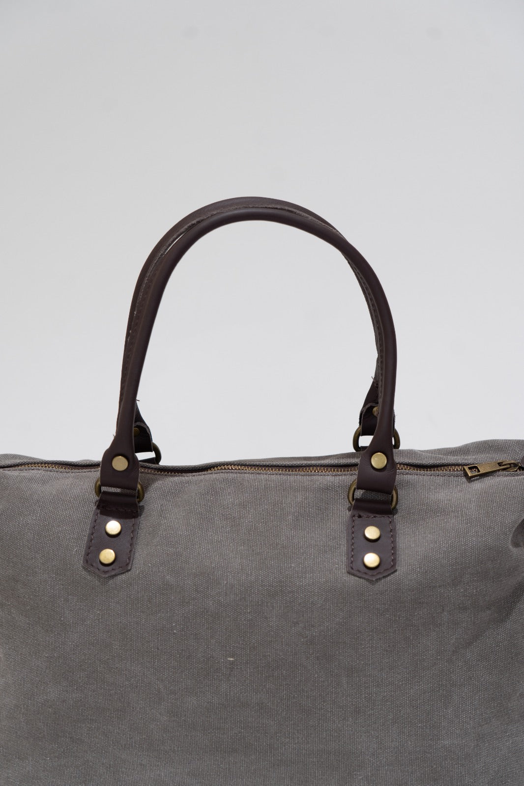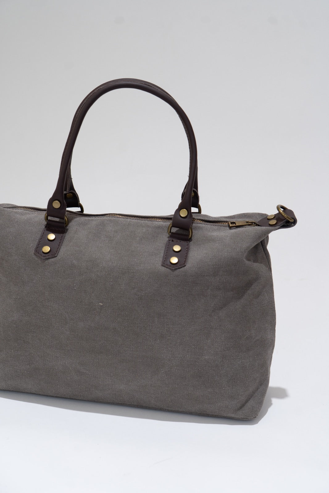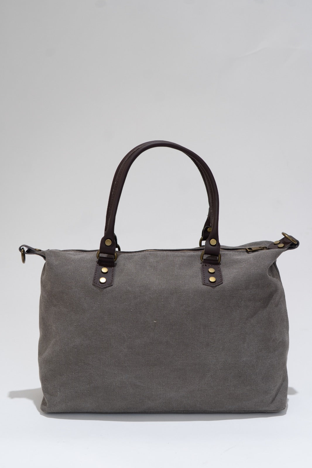 Bolso en loneta, con asas fijas en piel y correa extraíble y ajustable de algodón en color marrón chocolate. Cierre con cremallera, forro interior en negro y bolsillo interior. En color gris.