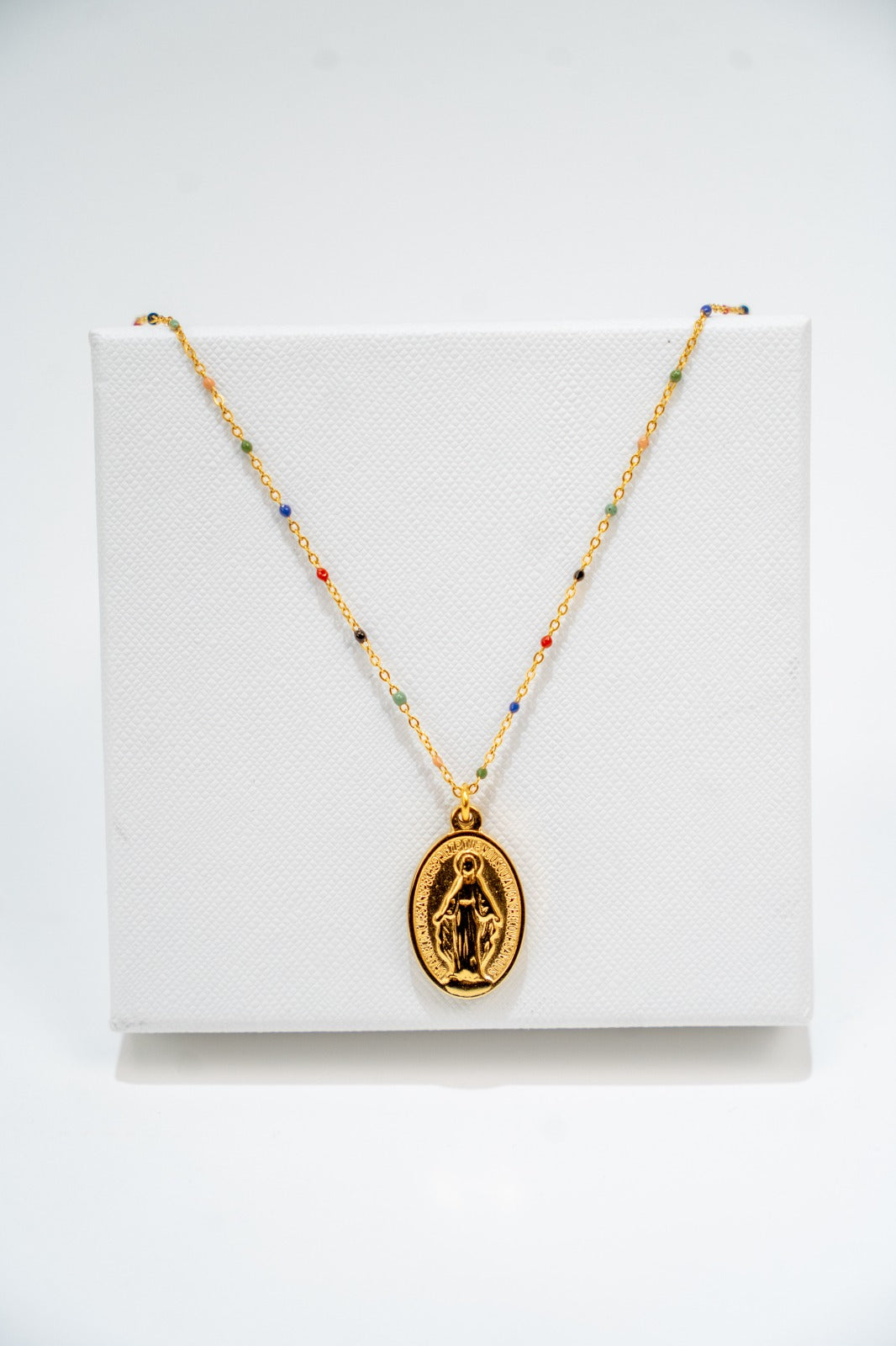 Colgante con cadena con detalle bolas multicolor y medalla con relieve.