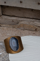 Pulsera, brazalete en piel, pieza metalizada grabada con piedra natural. En color dorado.