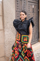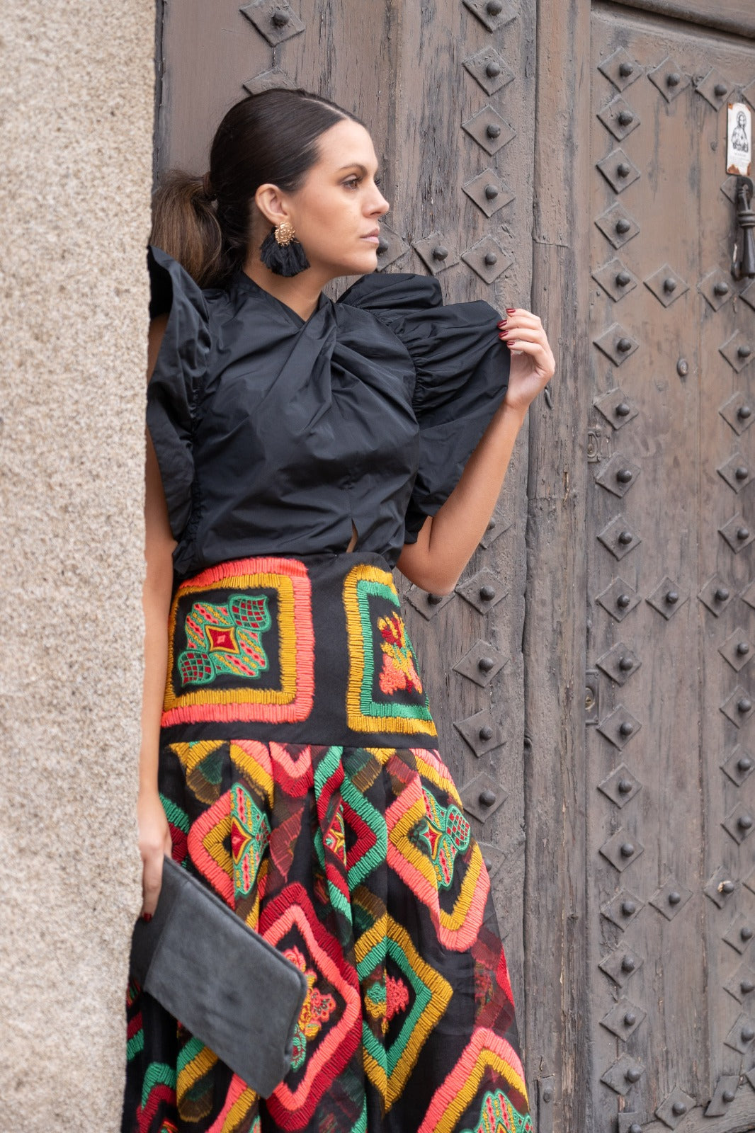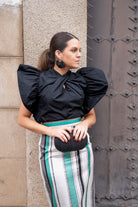 Camisa en tafetan, escote drapeado y cruzado, alerones a modo volantes pronunciados en hombros, pequeña abertura frontal. En color negro.