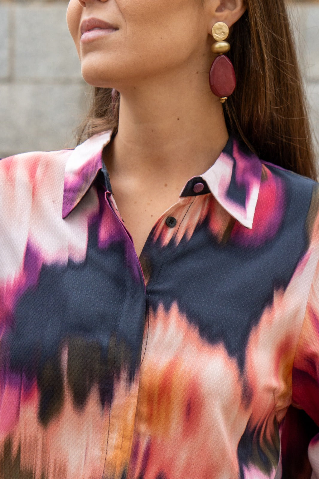 Camisa básica, manga larga con puño engomado, abotonada, estampado difuminado multicolor.