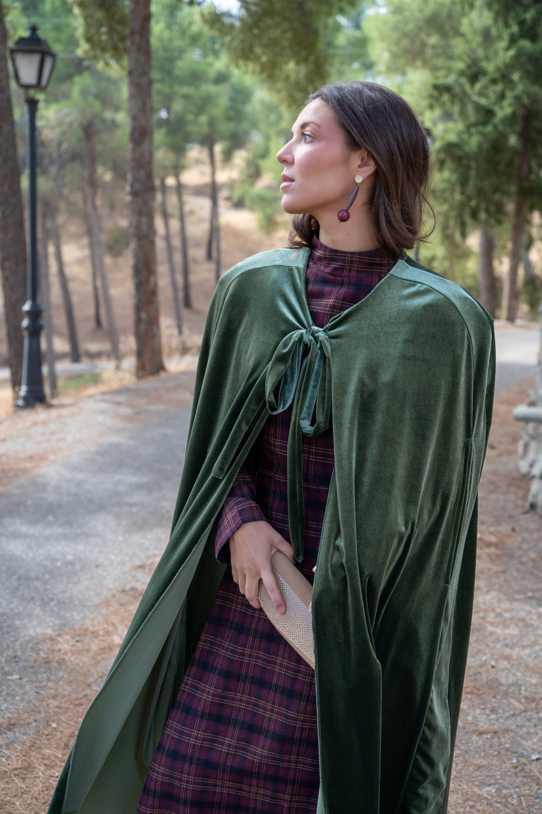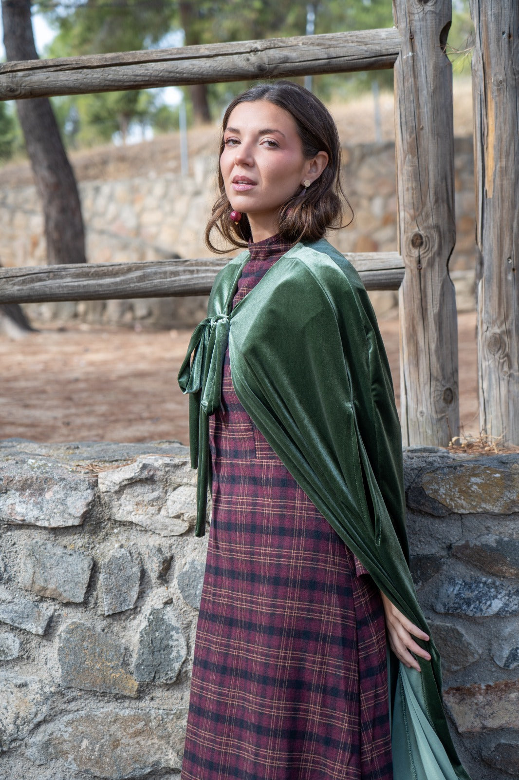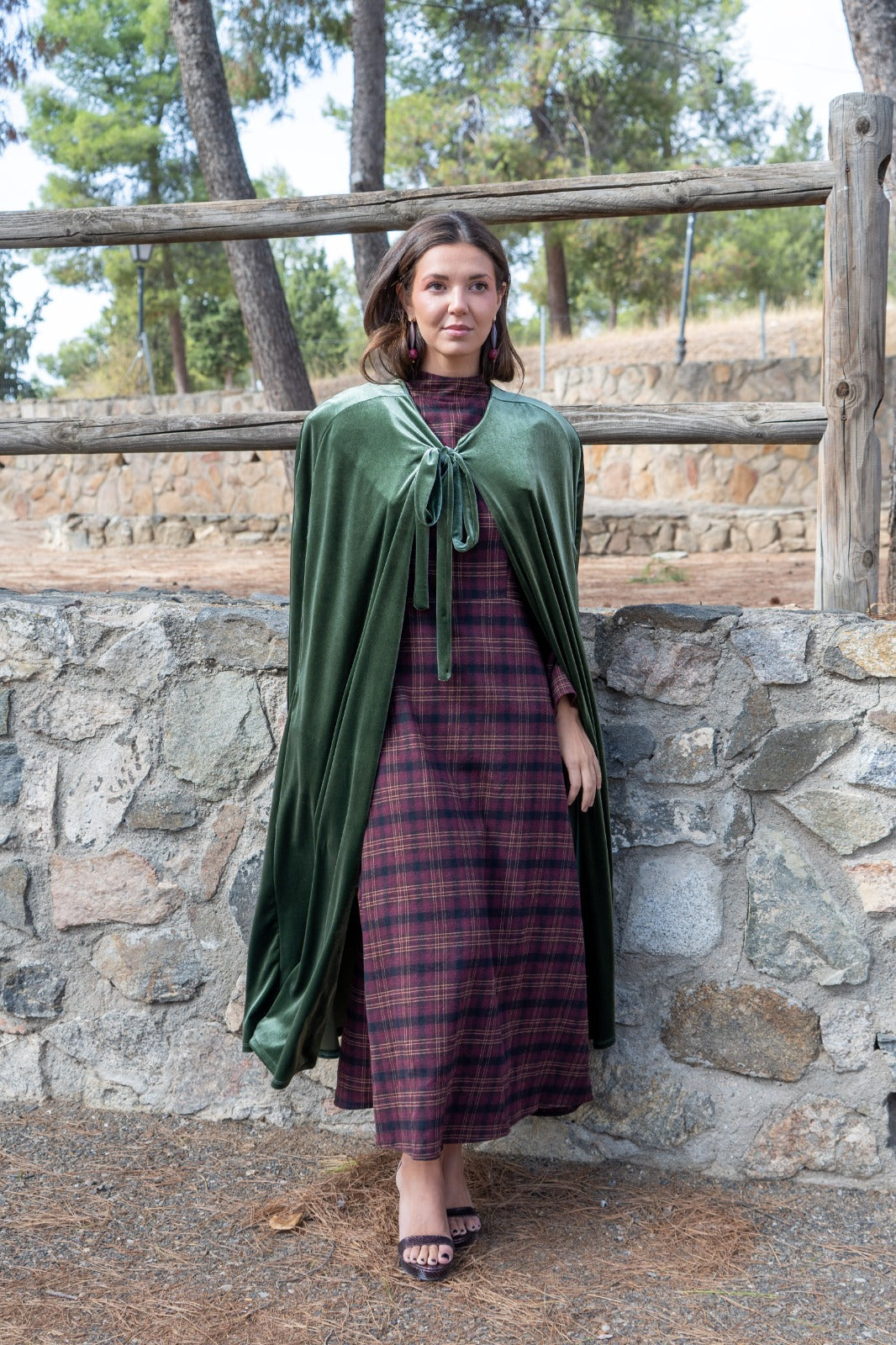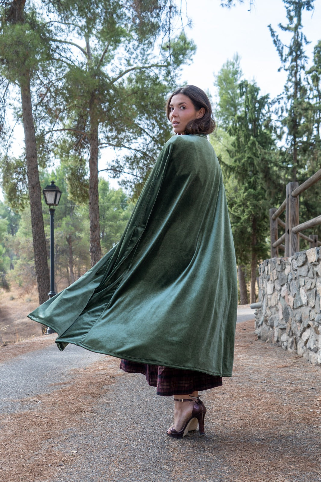 Capa en terciopelo, abertura para meter las manos, 120cm aprox de largo, con lazo para anudar al cuello. En color verde.