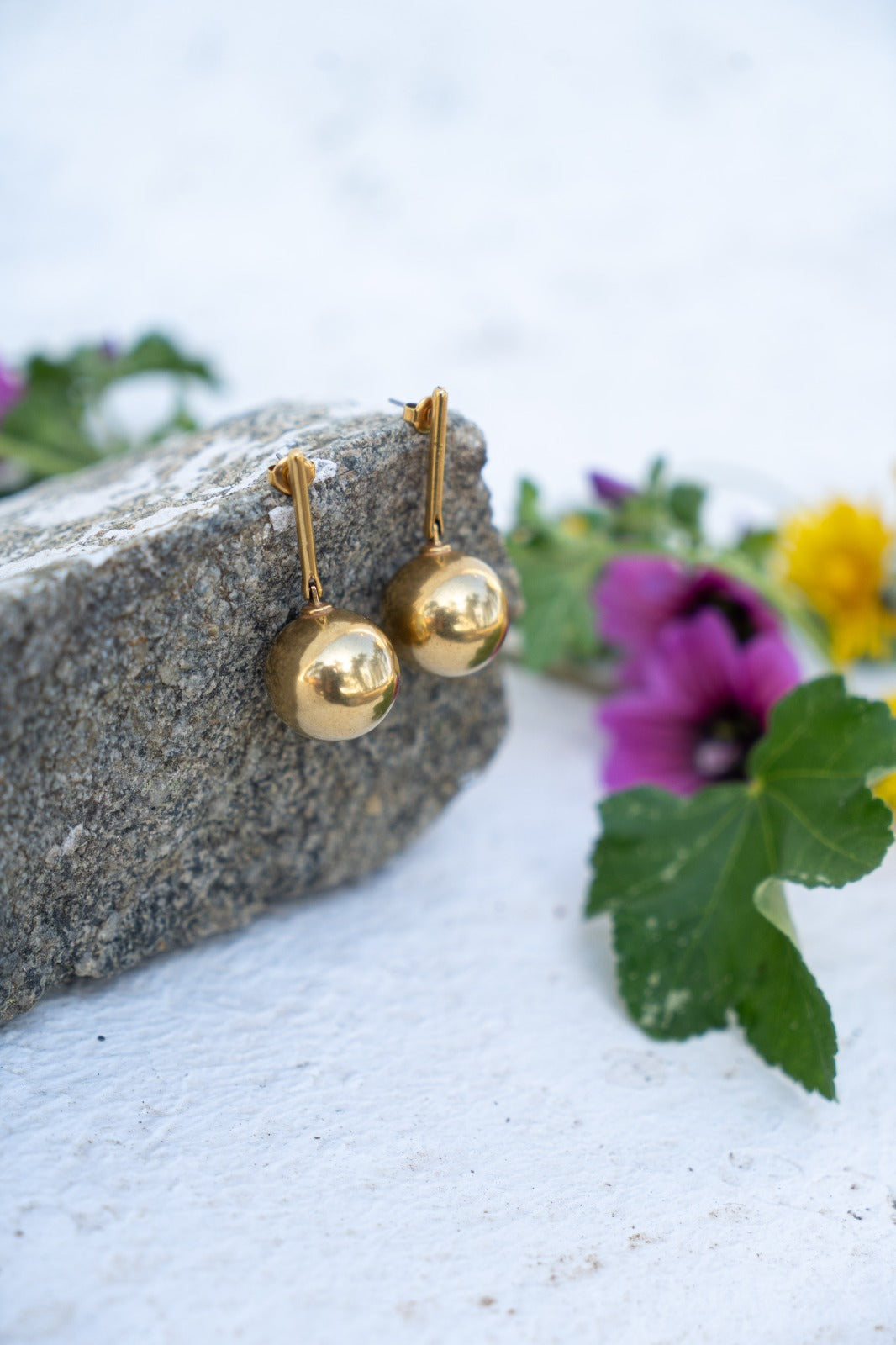 Pendientes elgantes, con esfera dorada que culega de una barra dorada, estructura geometrica y dorada.
