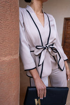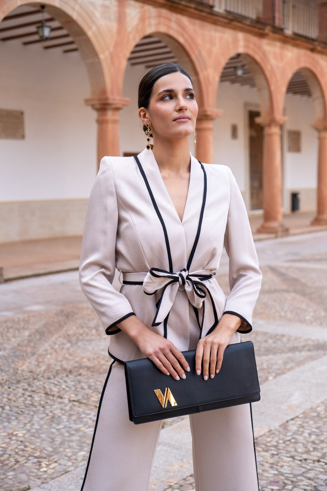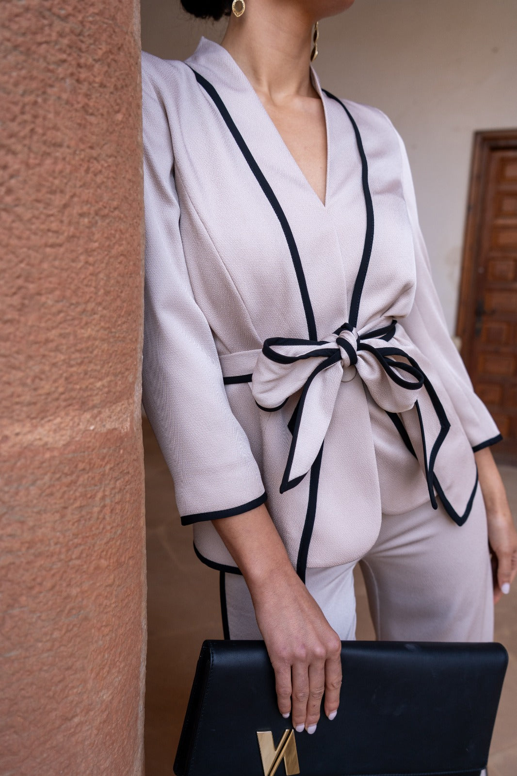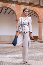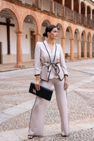 Conjunto compuesto por chaqueta cruzada cerrada con cinturón y pantalón tiro alto ancho. En color beige con vivos en color negro.