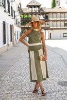 Conjunto compuesto por top cuello redondo, escote trasero anudado a la espalda y falda alta, corte evase. Bicolor verde y beige.