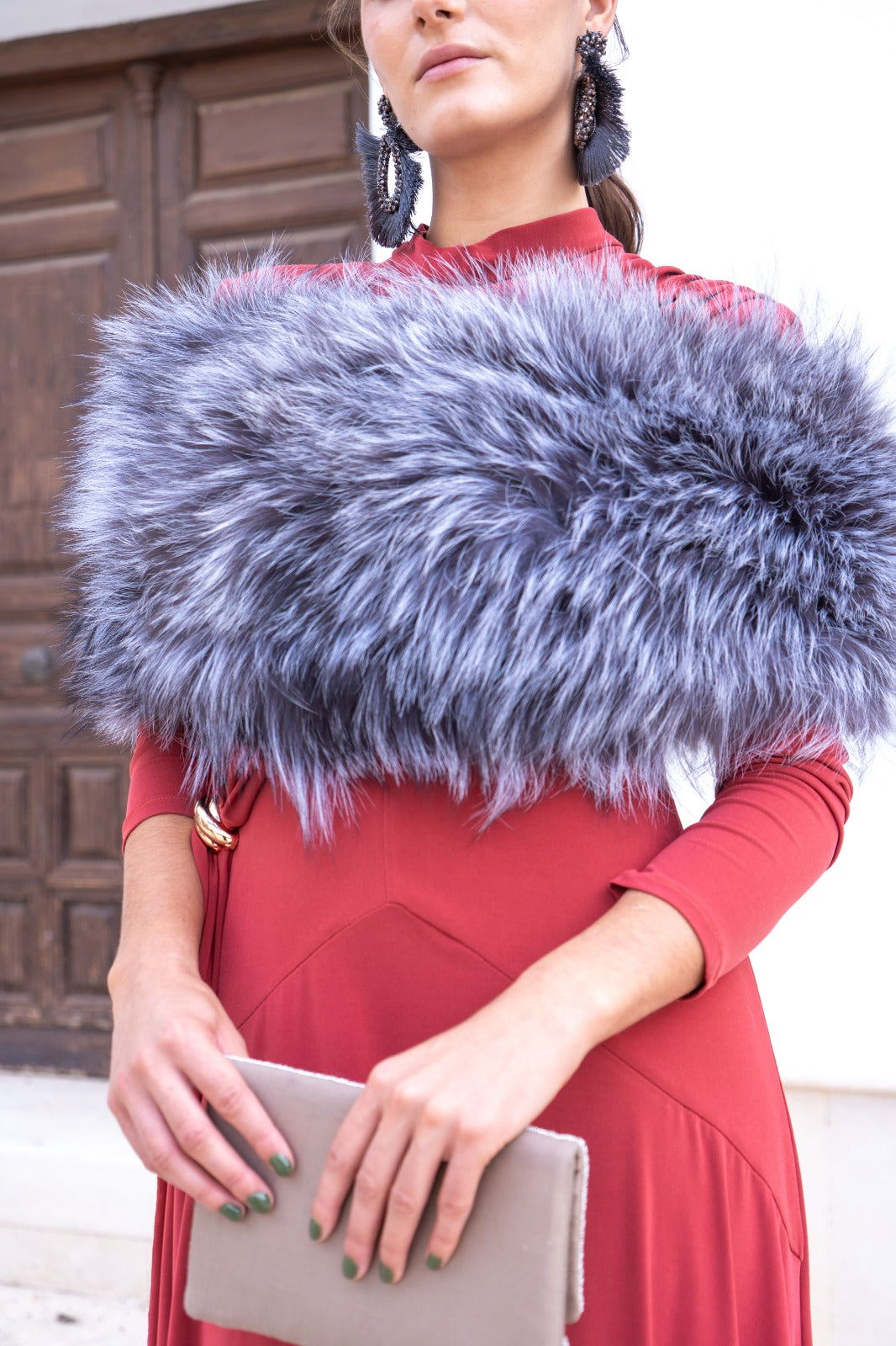 Estola pelo natural, redonda, elástica, para cubrir los brazos. En color gris.