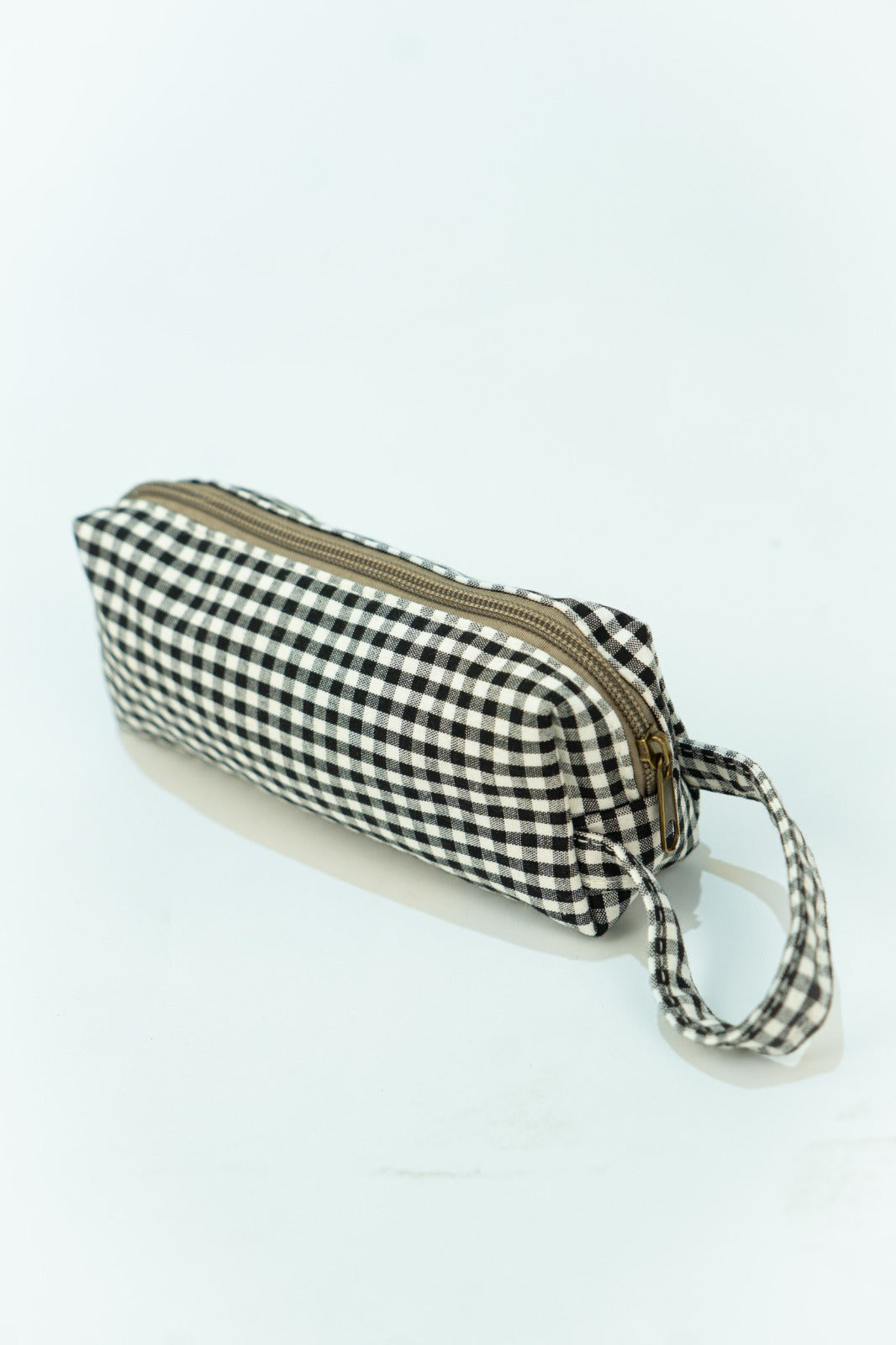 Estuche o neceser pequeño, cierre con cremallera, asa a un lado. En vichy blanco y negro.
