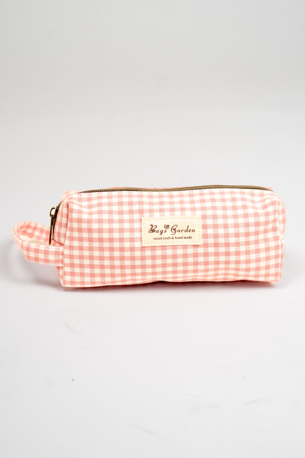 Estuche o neceser pequeño, cierre con cremallera, asa a un lado. En vichy blanco y rosa.