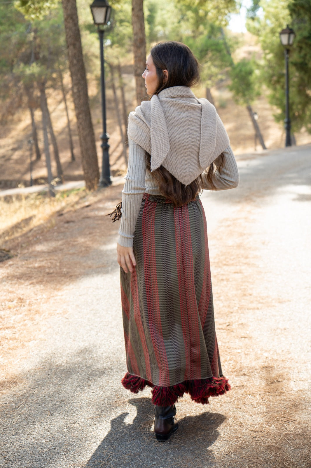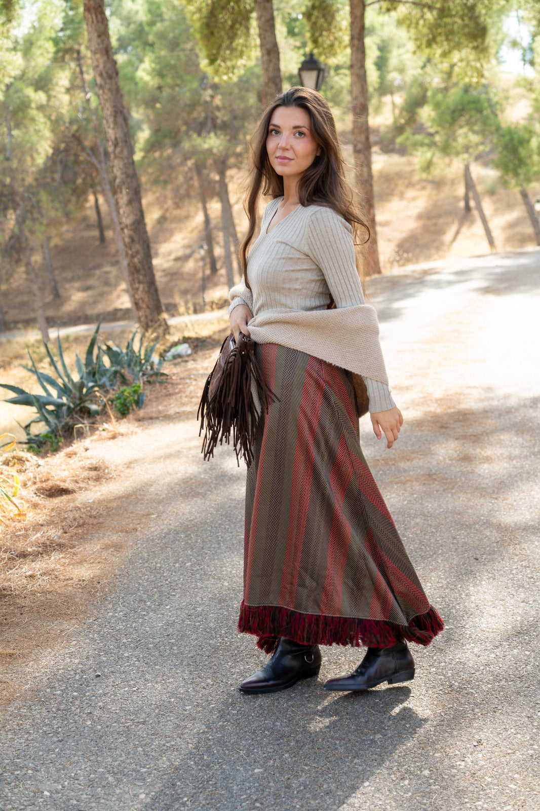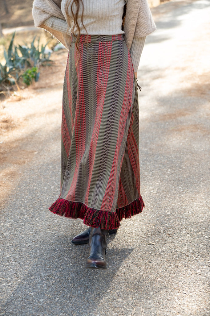 Falda midi, goma en la parte trasera de la cintura, evase, en rayas verde y burdeos, asimétrica y flecos en el bajo.