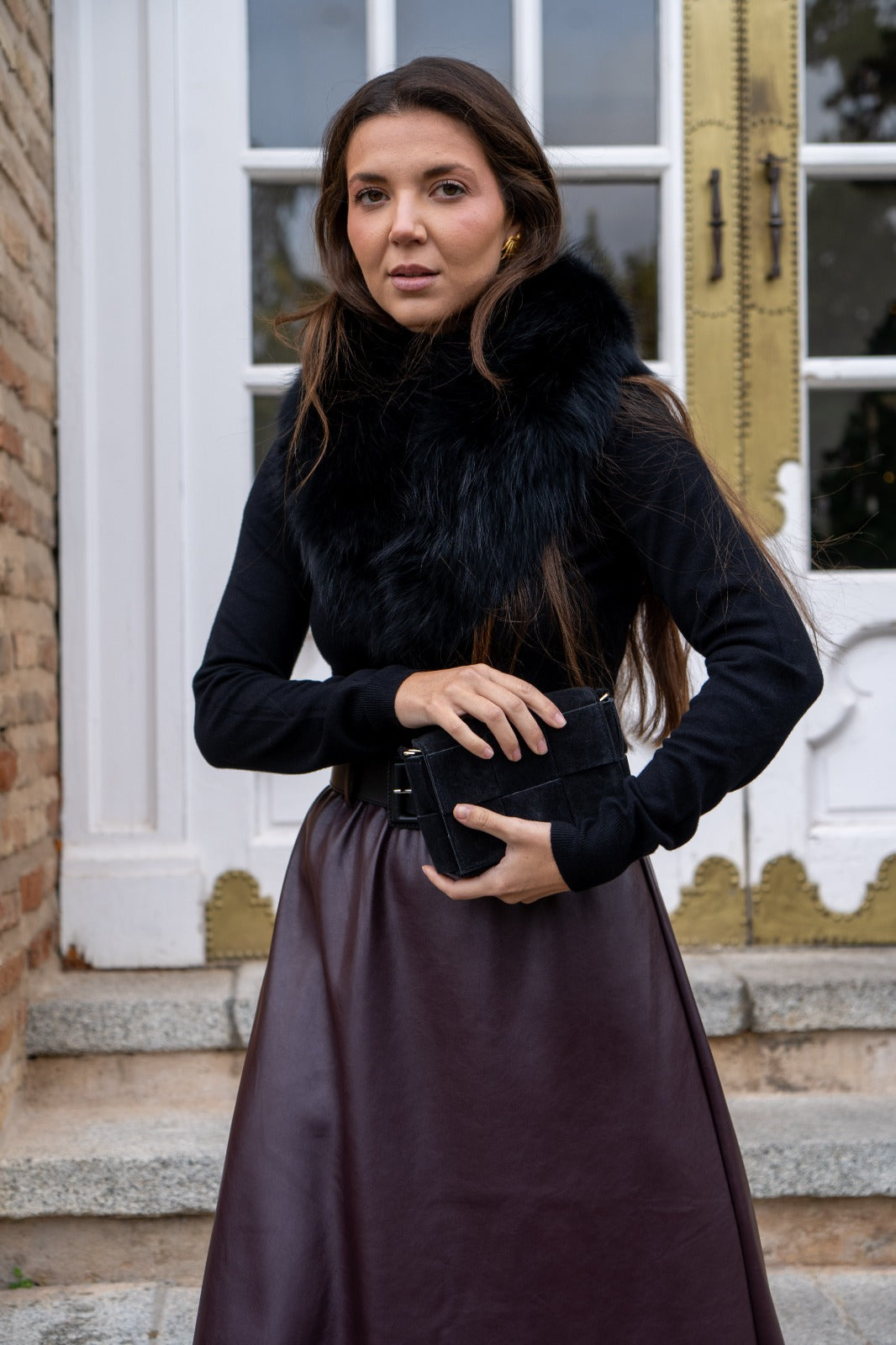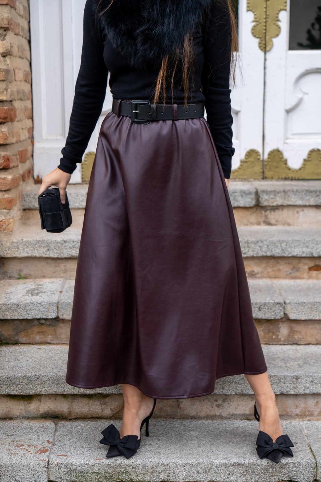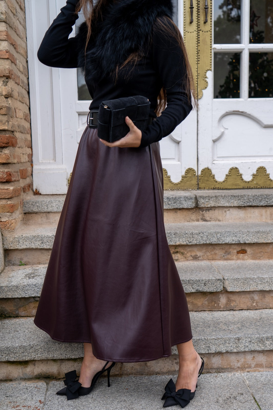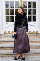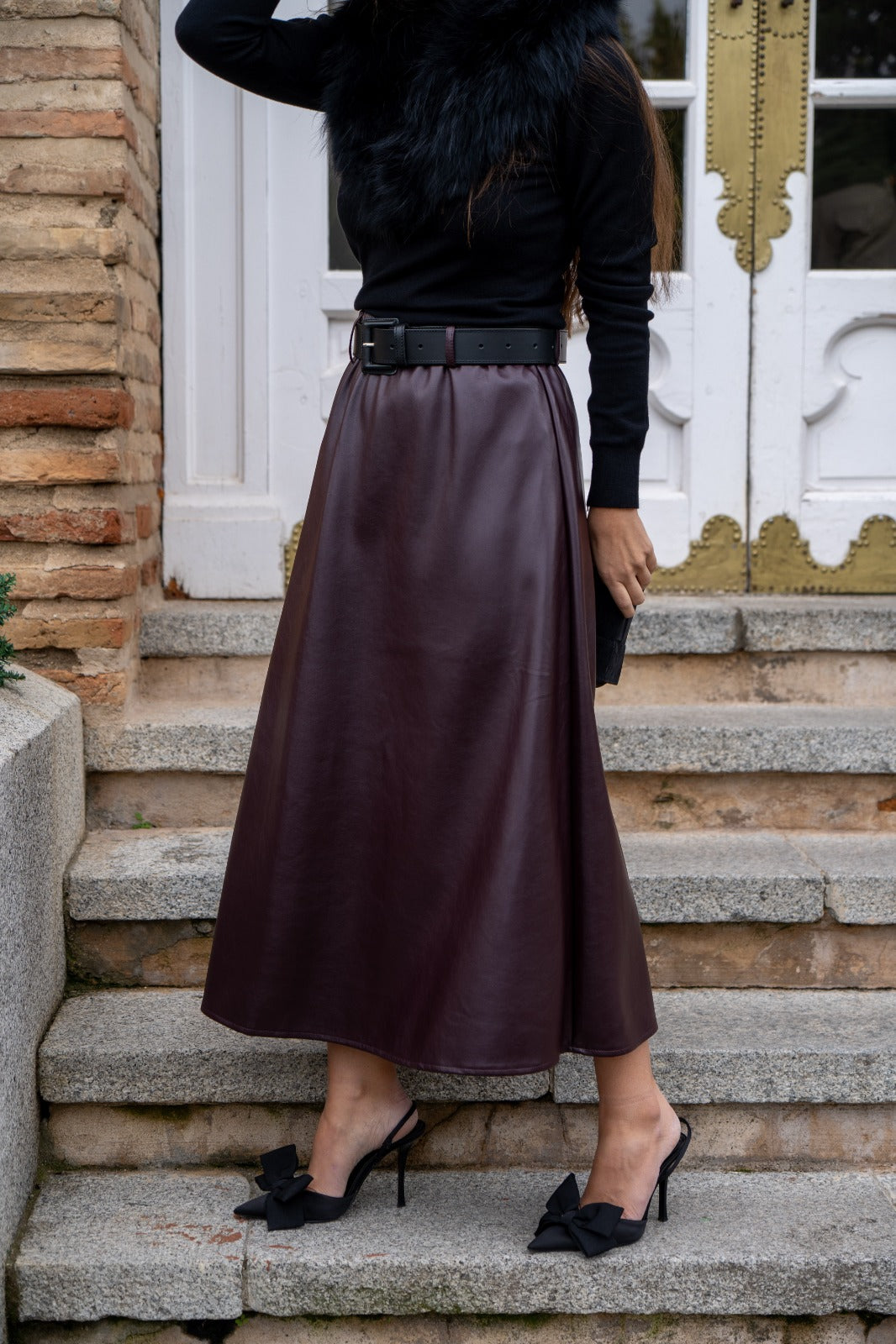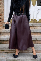 Falda en poli piel, cintura engomada, corte evase, en color burdeos.