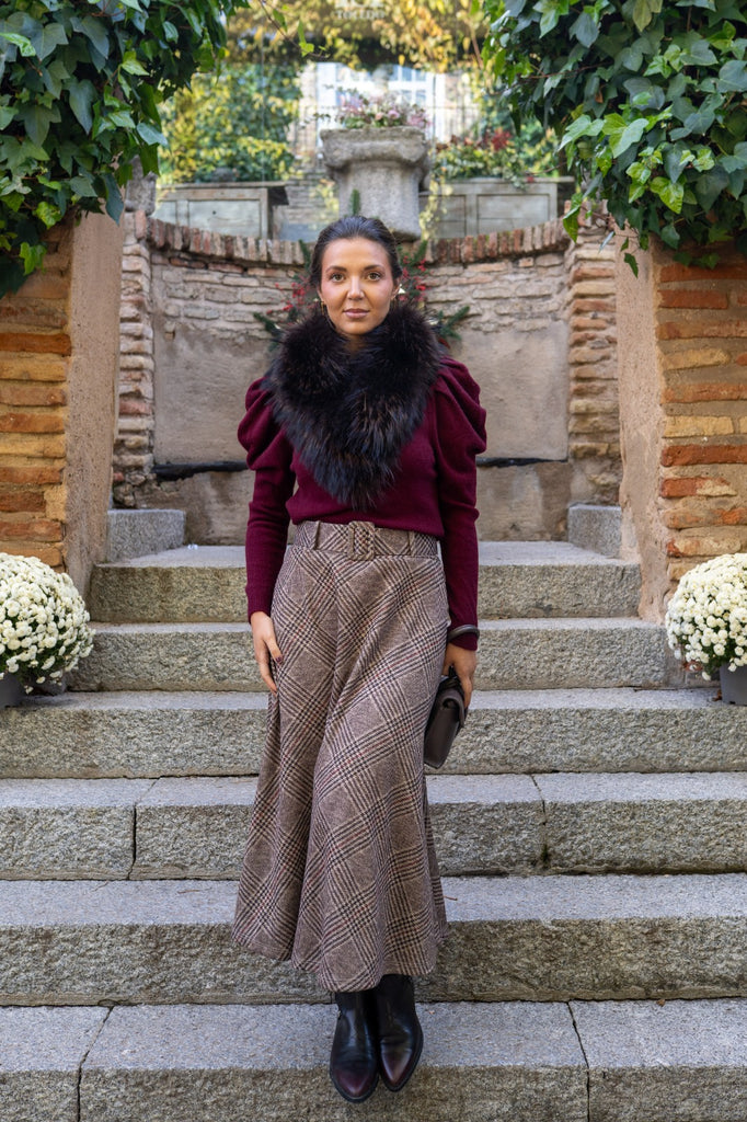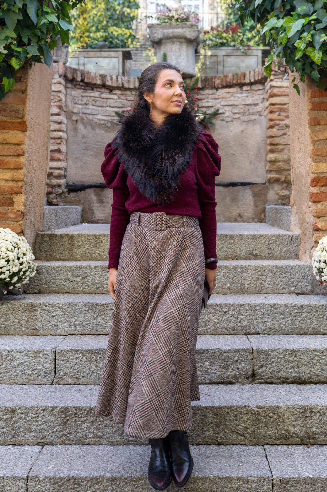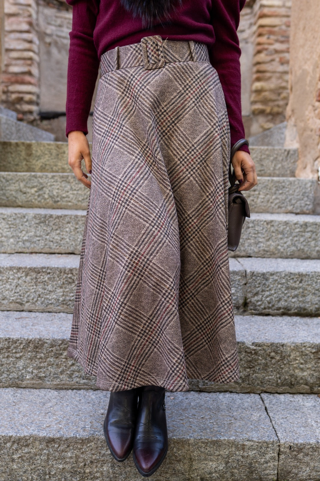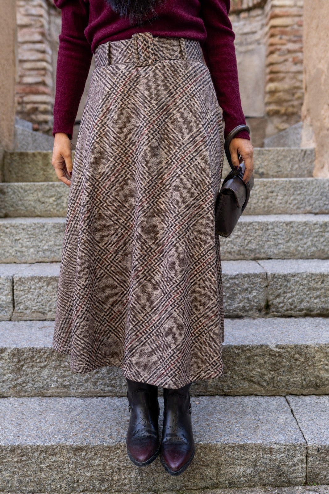 Falda midi, cintura engomada, en cuadros marrones, cinturón incluido.