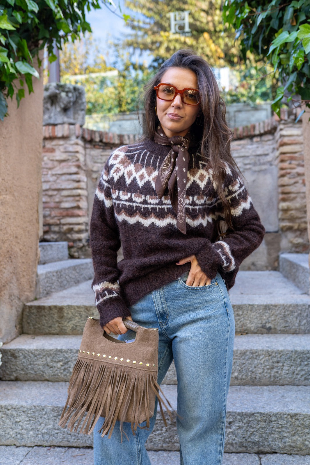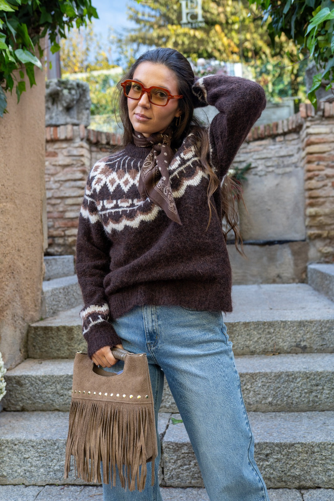 Jersey cuello redondo, cenefa de colores en el pecho. En color marrón y beige.