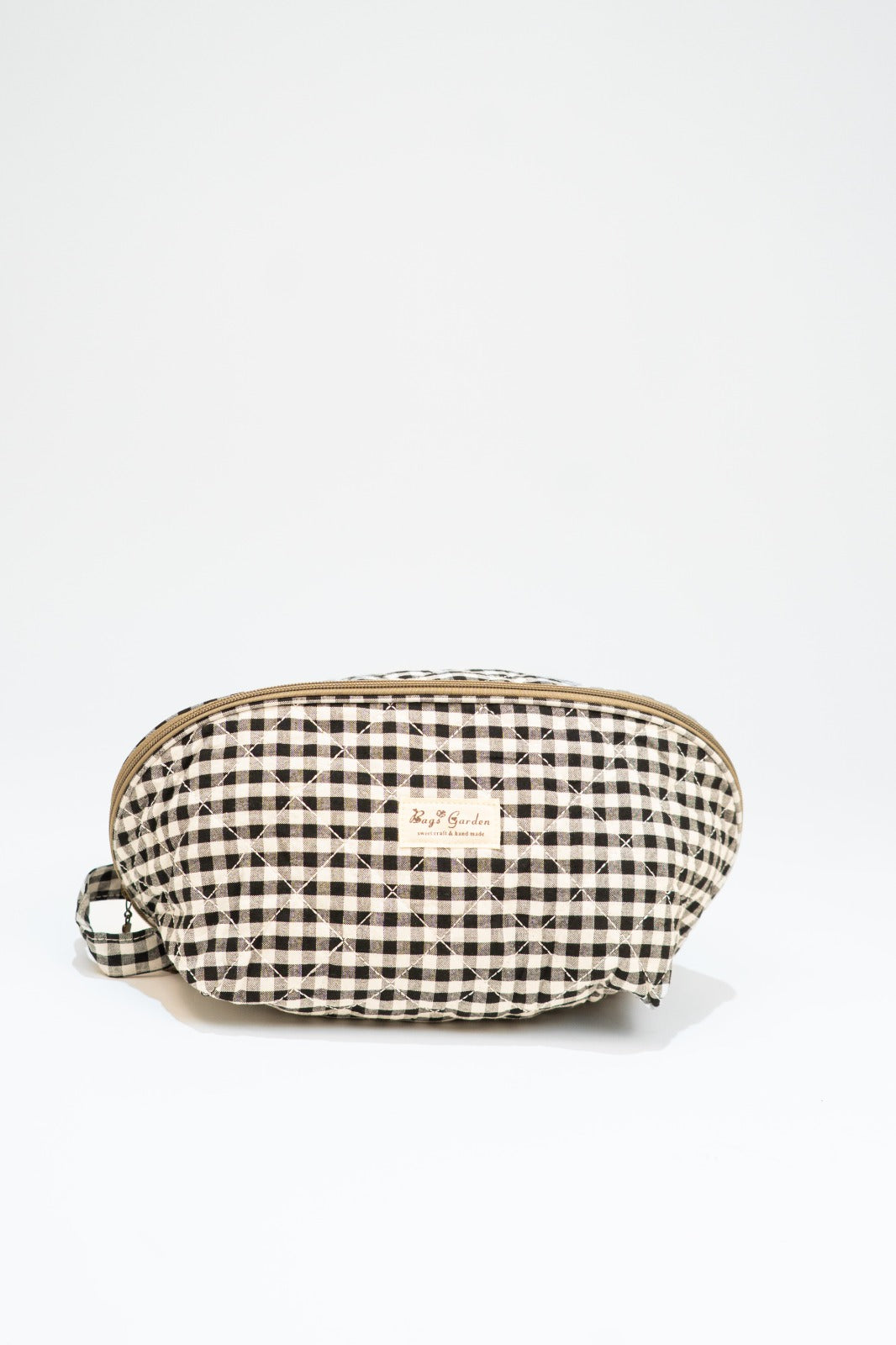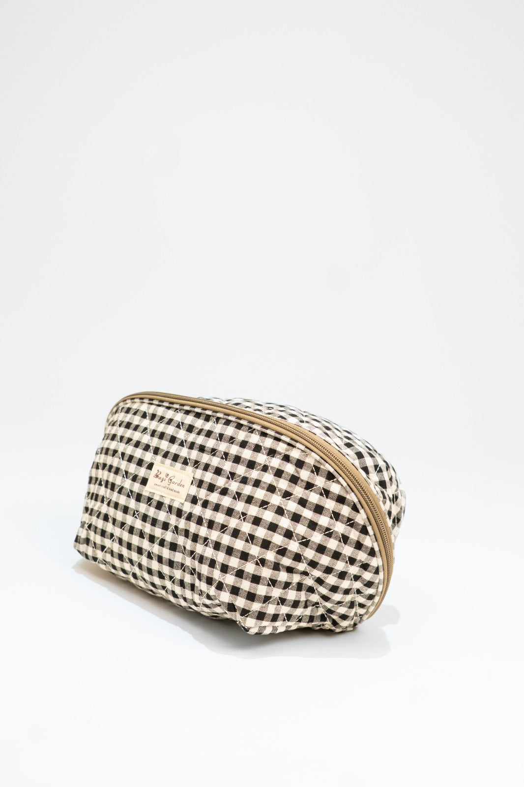 Neceser cierre con cremallera, asa en un lado, bolsillos interiores, en vichy blanco y negro.