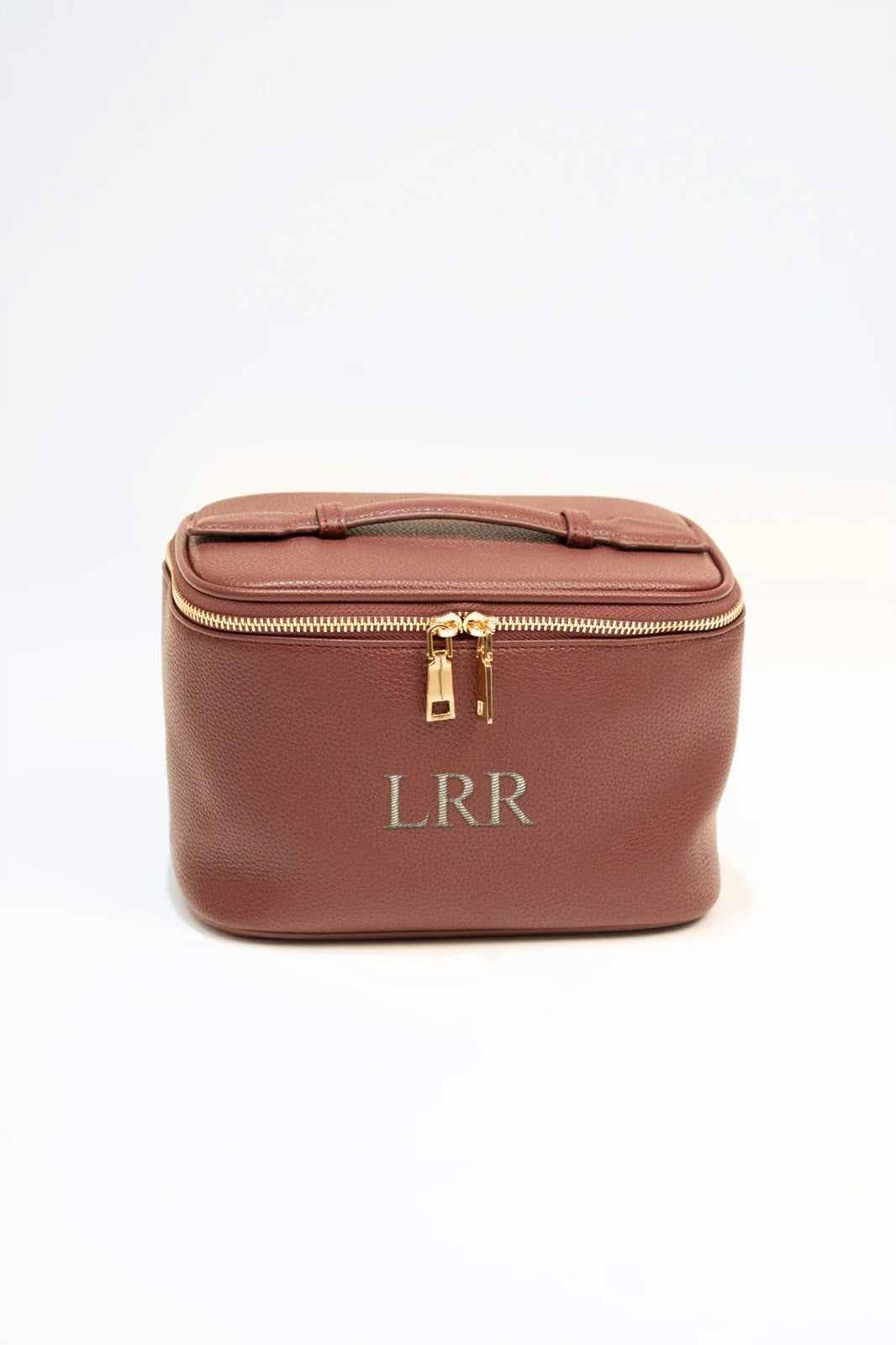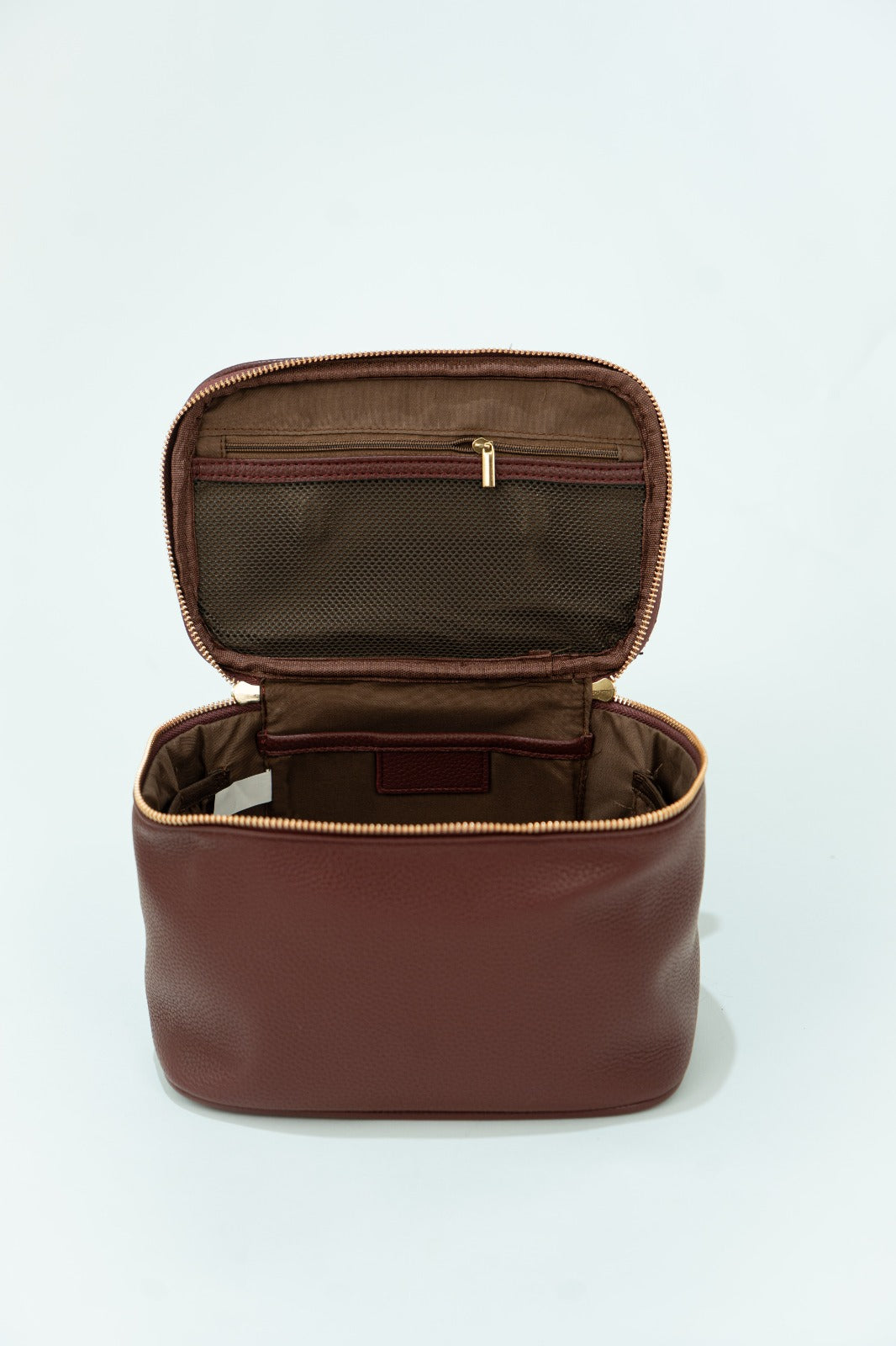 Neceser en poli piel burdeos, cierre con cremallera, asa superior, bolsillos interiores.