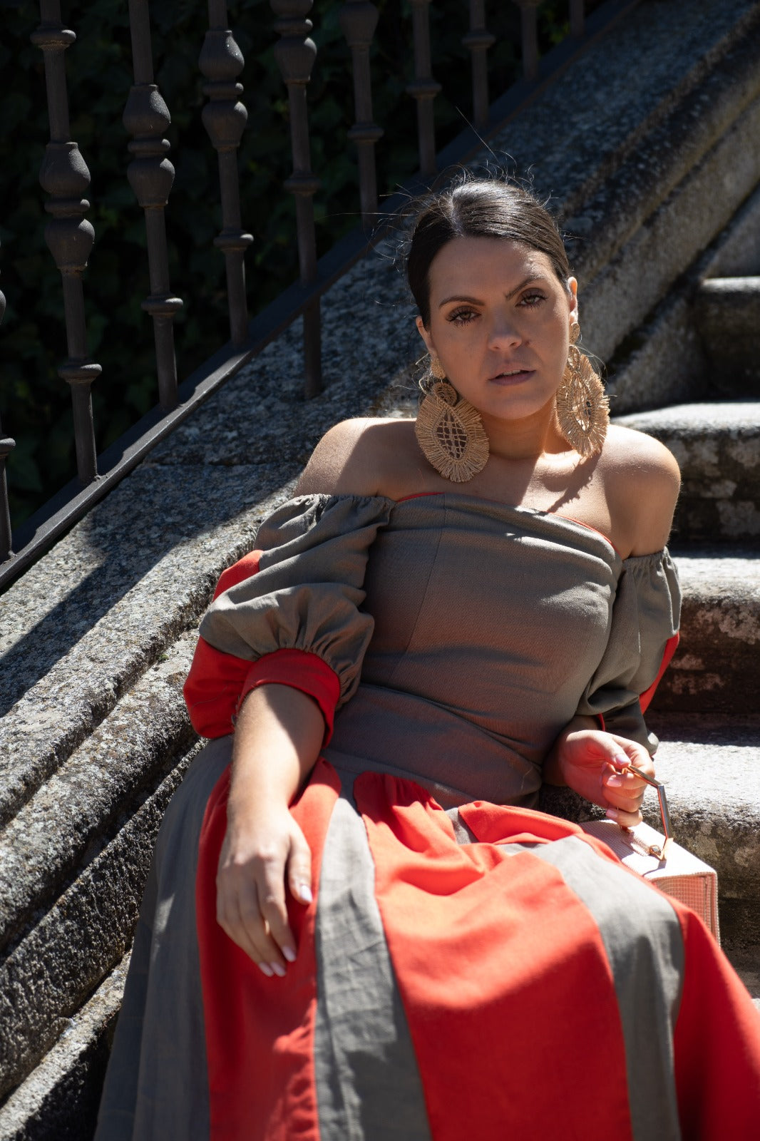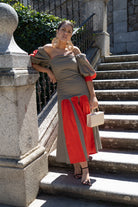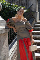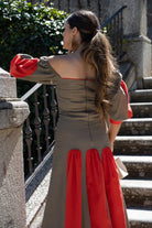 Vestido midi, ,escote cuadrado, manga farol, falda con cortes godet. En lino bicolor marron y rojo.