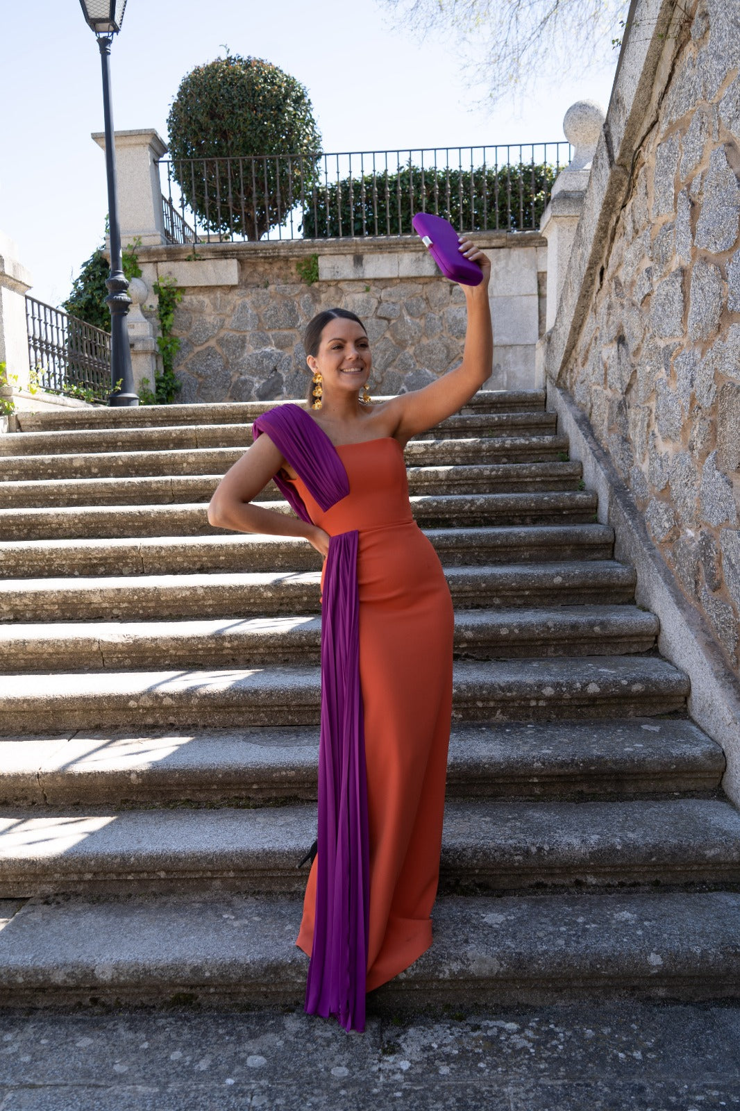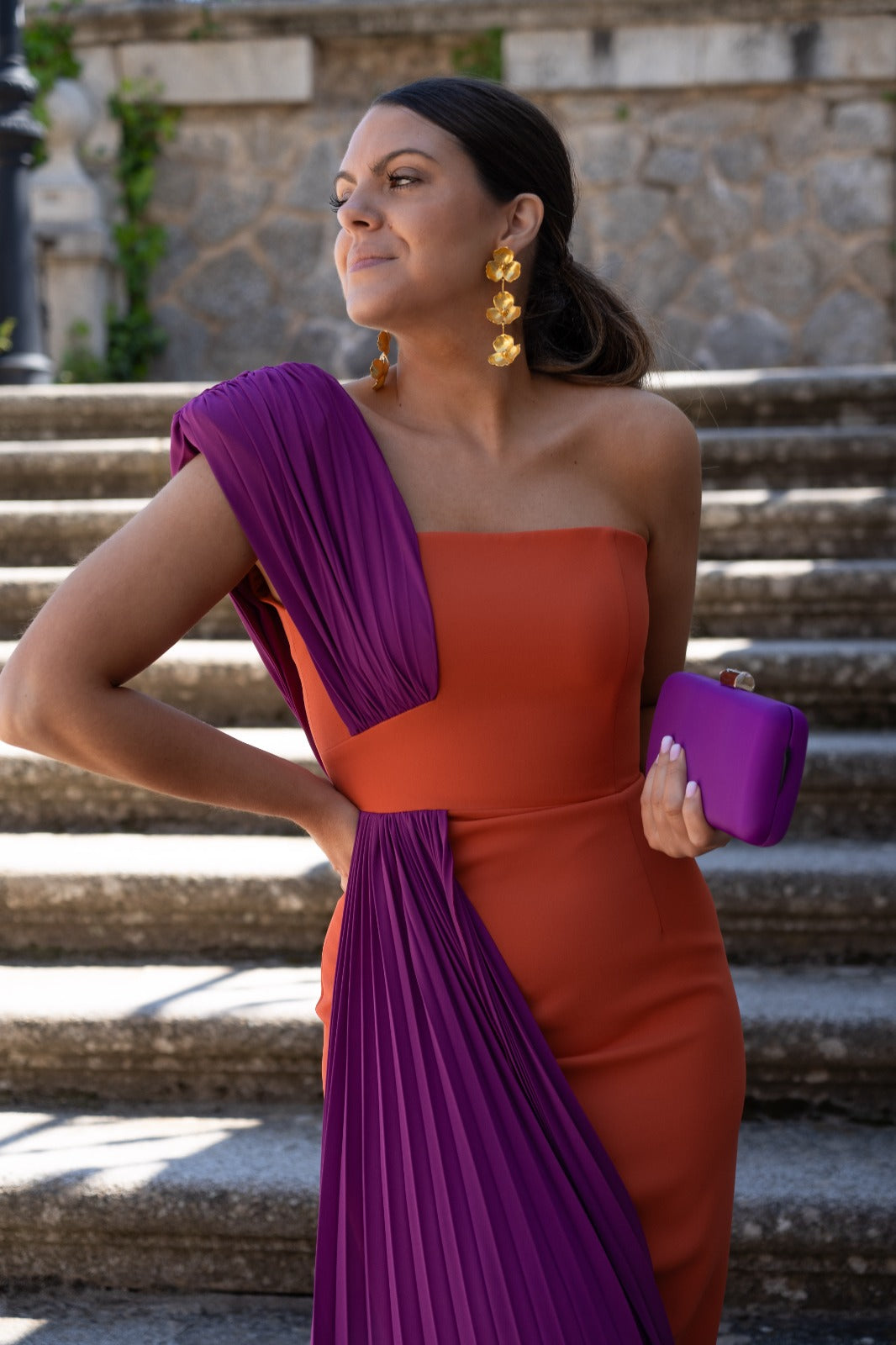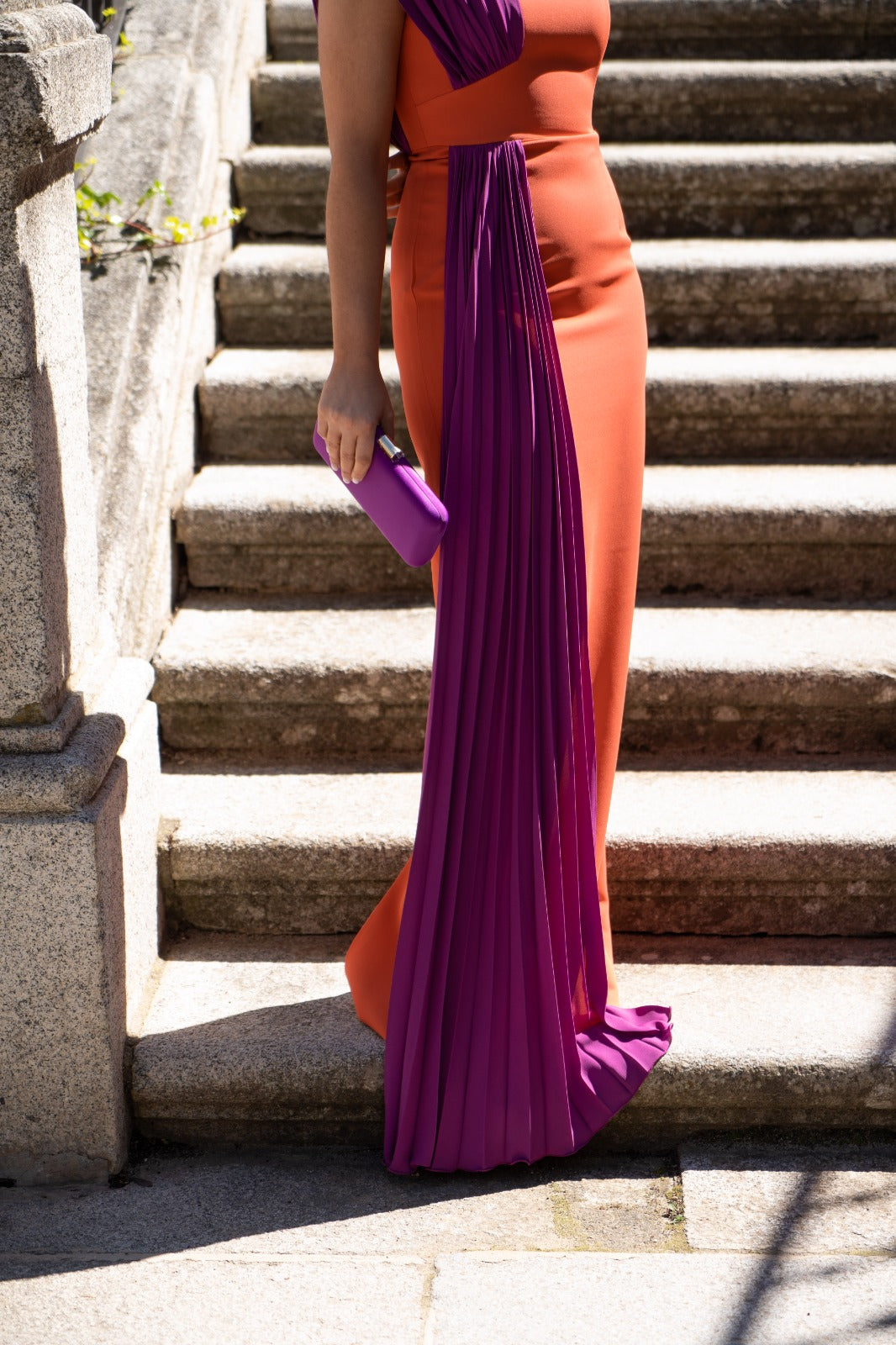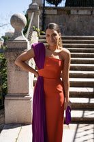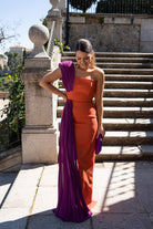 Vestido largo asimétrico en crepé simulando palabra de honor con plisado de georgette que cubre el hombro marcado. Corte en cintura con falda recta y corbatín plisado simulando que sigue a la pieza del hombro. En color coral y morado.
