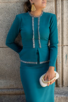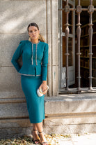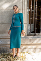 Vestido midi, escote redondo, manga larga, detalle fecos delanteros, plepum en cintura. En color verde.