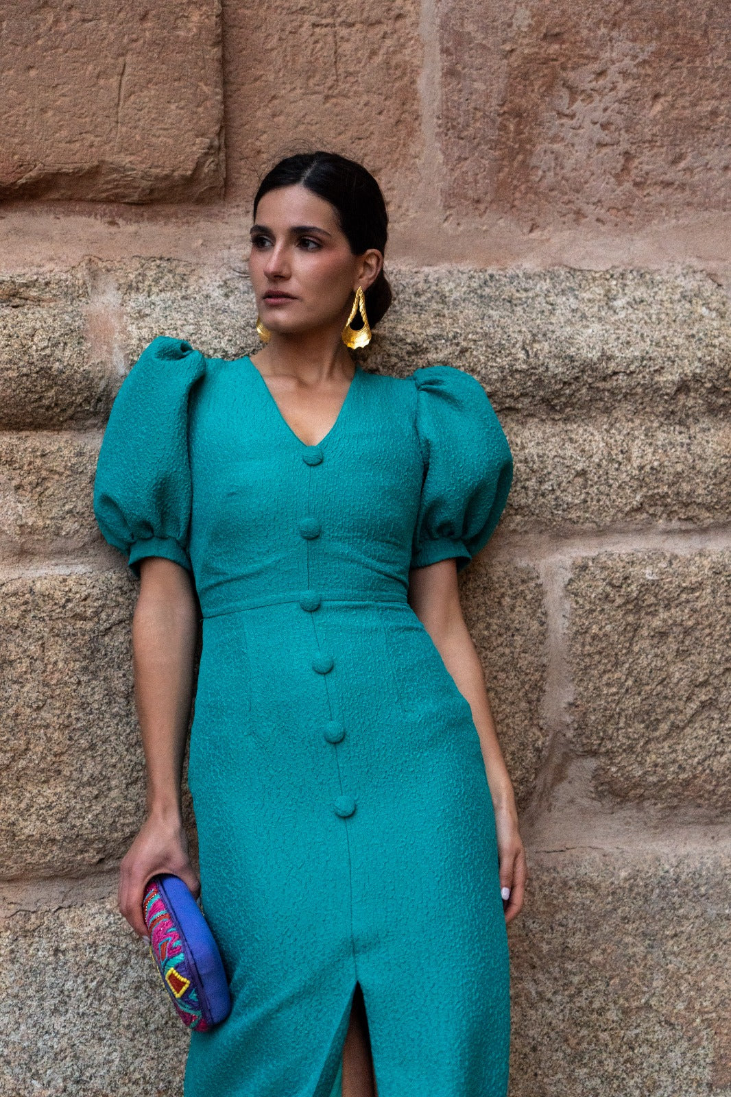 Vestido midi, escote en forma de V, manga corta abullonada, detalle botones delanteros (no se abren), abertura delantera. En color verde.
