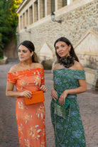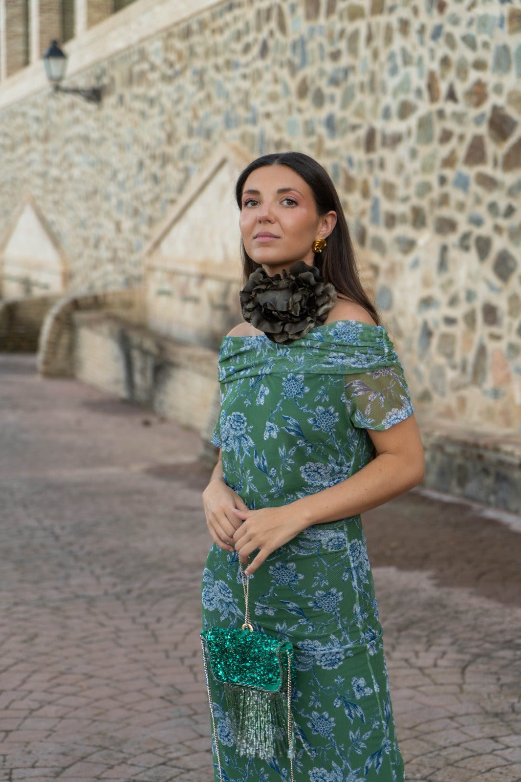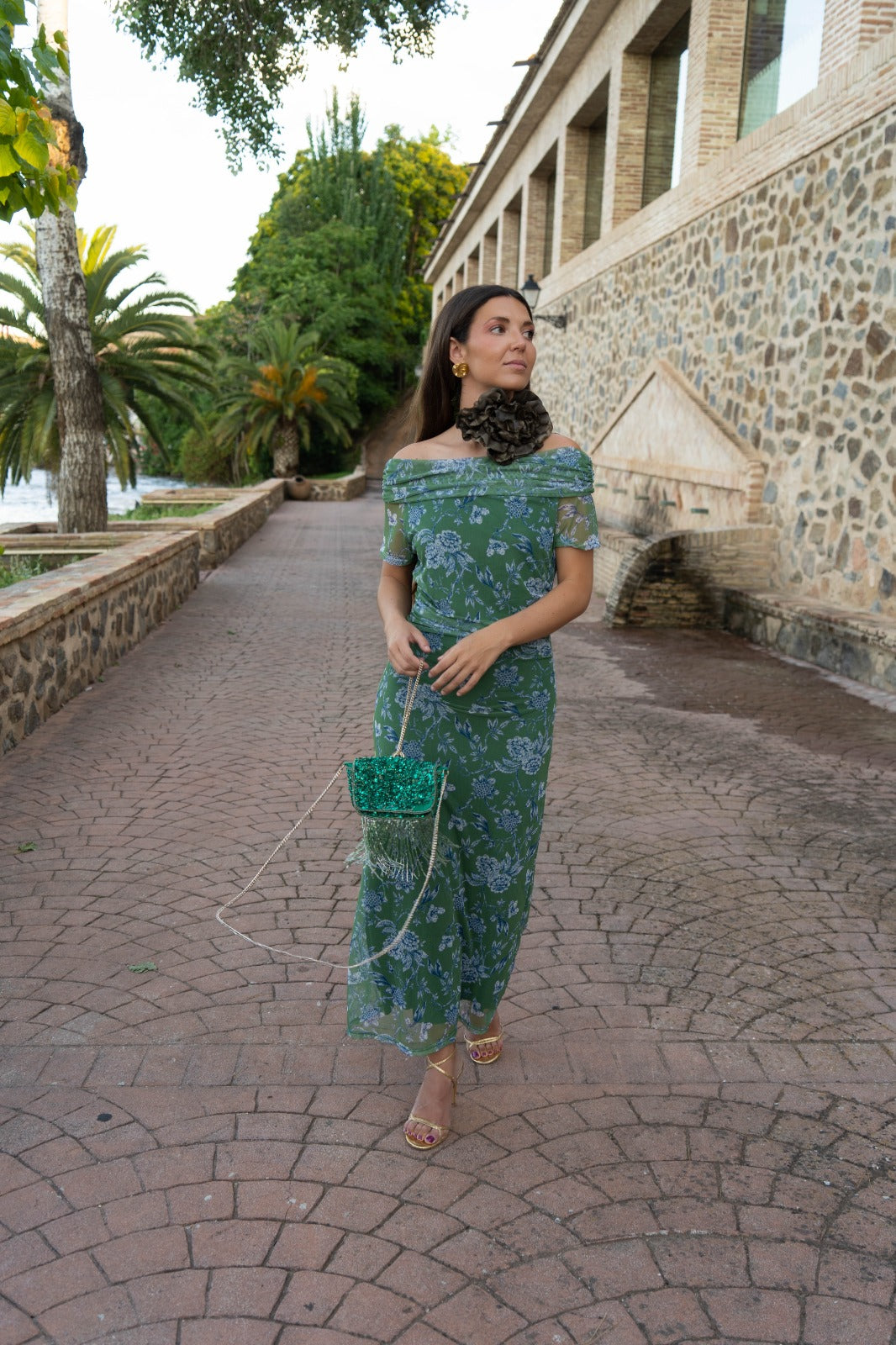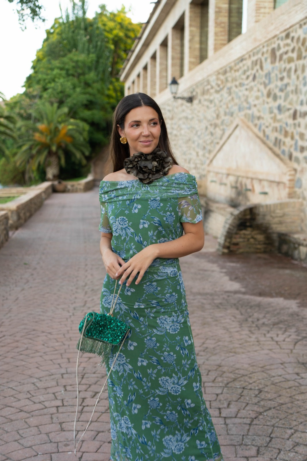 Vestido midi, hombros descubiertos, manga corta, totalmente elastico. En color verde con estampado.