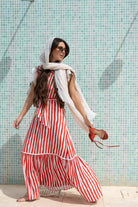 Vestido largo, escote camisero, sin mangas, volante abajo, cinturon para anudar. En rayas rojo y blanco.