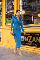 Vestido midi, escote a pico con cuello solapa y botones, manga larga con puño y botones, abertura trasera. En color azul.