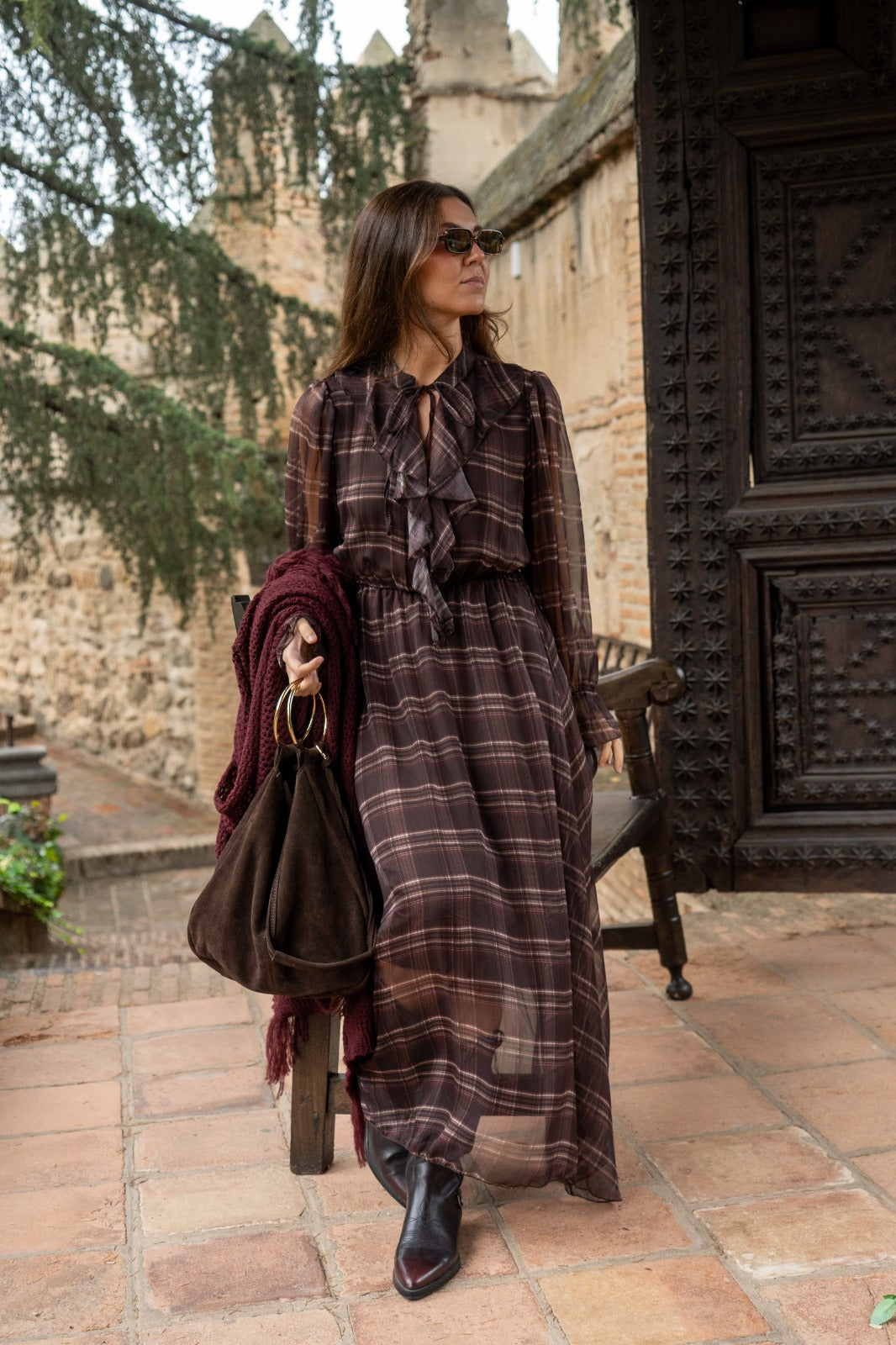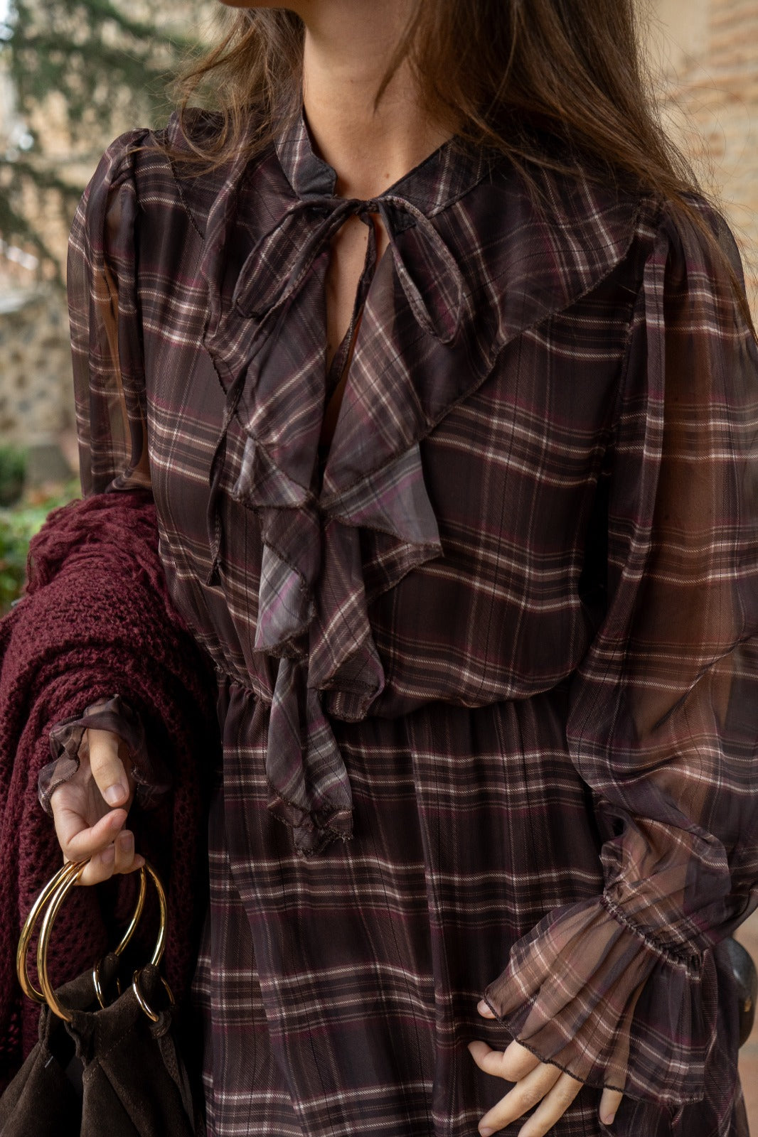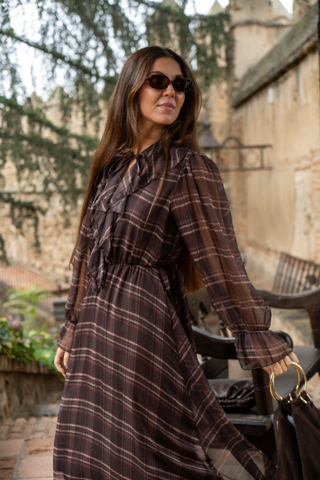 Vestido midi, escote redondo con lazo para anudar, manga en gasa con goma en puño, goma elástica en cintura. En marrón con estampado de cuadros.