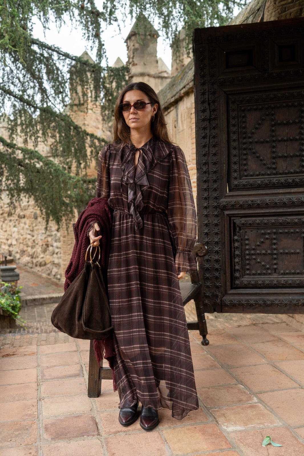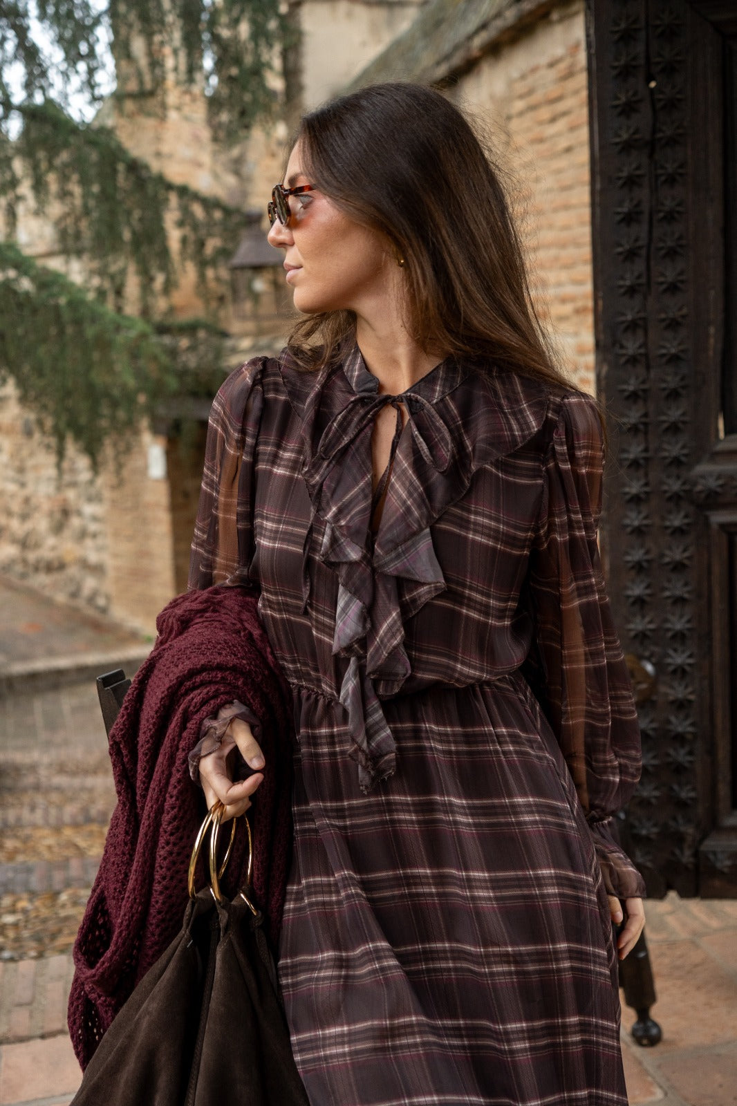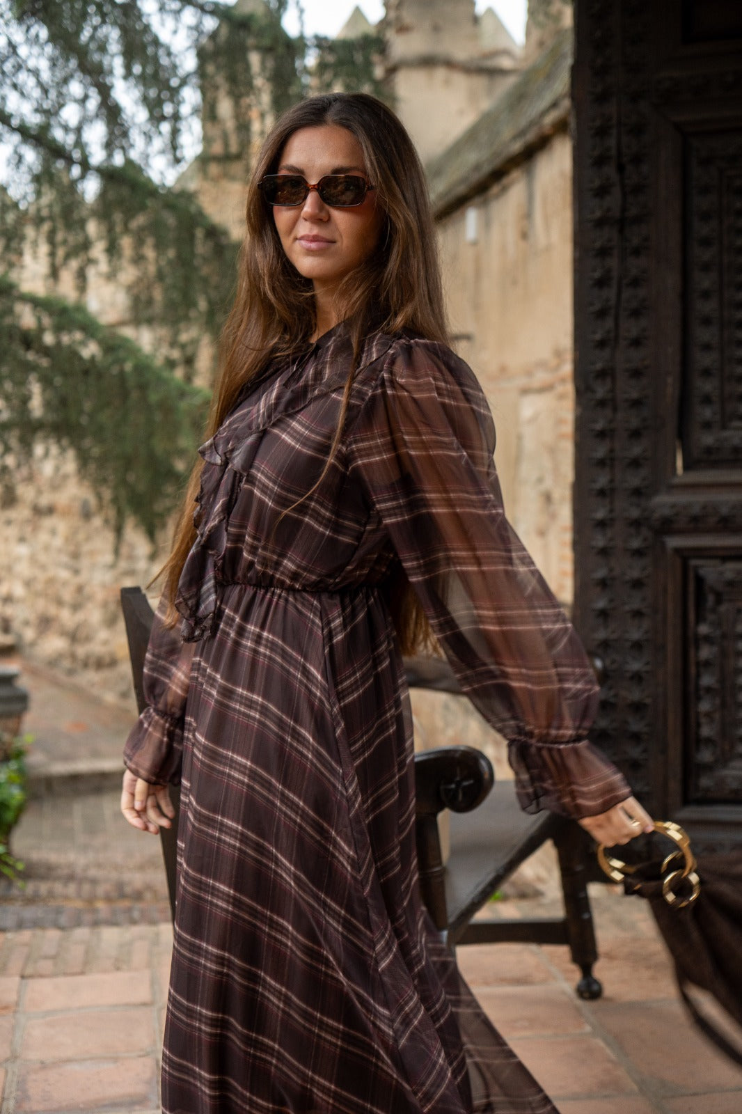 Vestido midi, escote redondo con lazo para anudar, manga en gasa con goma en puño, goma elástica en cintura. En marrón con estampado de cuadros.