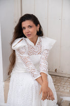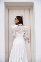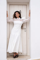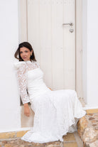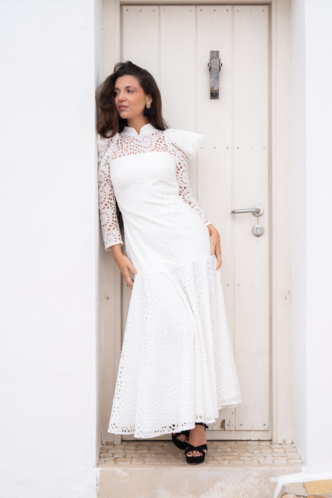 Vestido maxi midi, cuello subido, manga larga, con volante abajo. En color blanco, tejido calado.