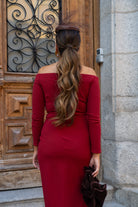 Vestido midi, escote barco, manga francesa, con nudo en cintura a un lado. En color rojo.