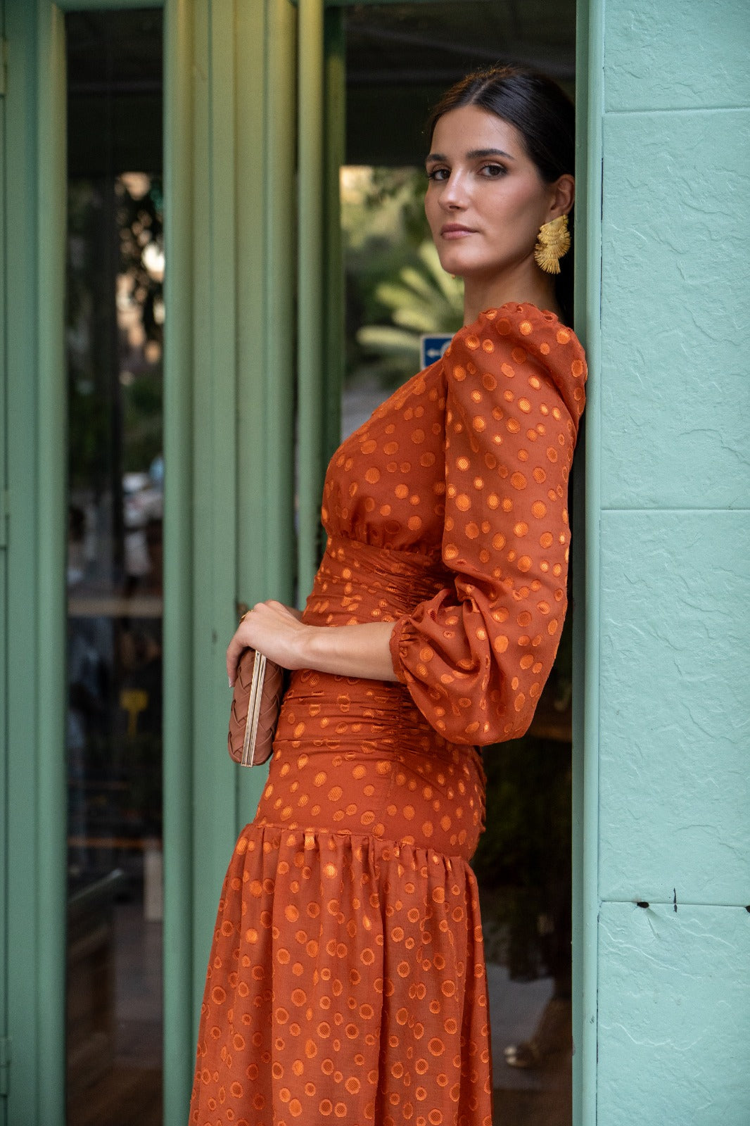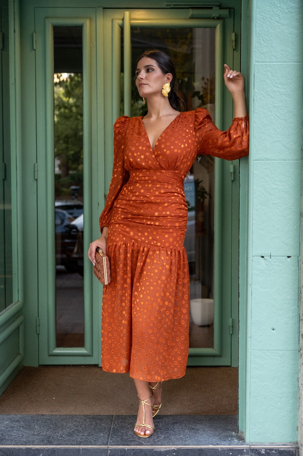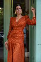 Vestido escote a pico cruzado, manga larga, fruncido en la parte delantera y trasera, volante abajo. En color marrón con lunares.
