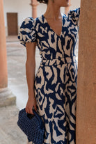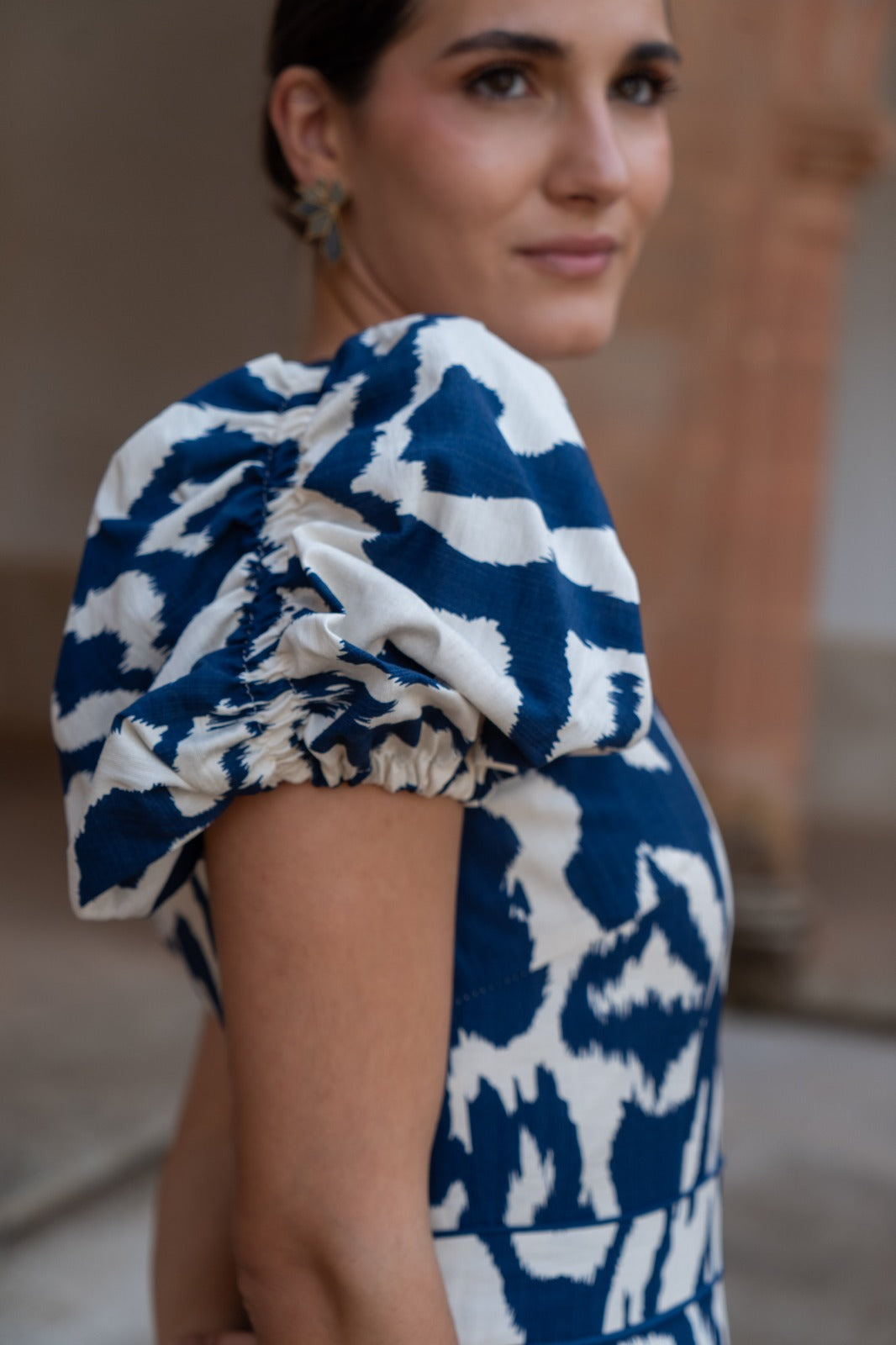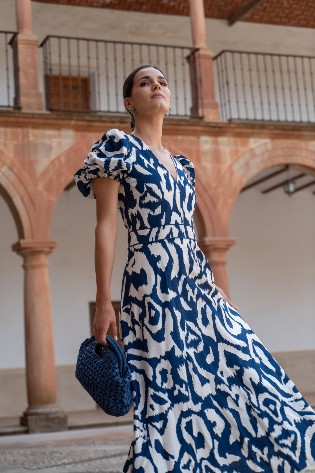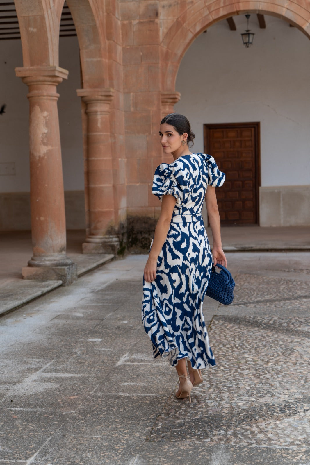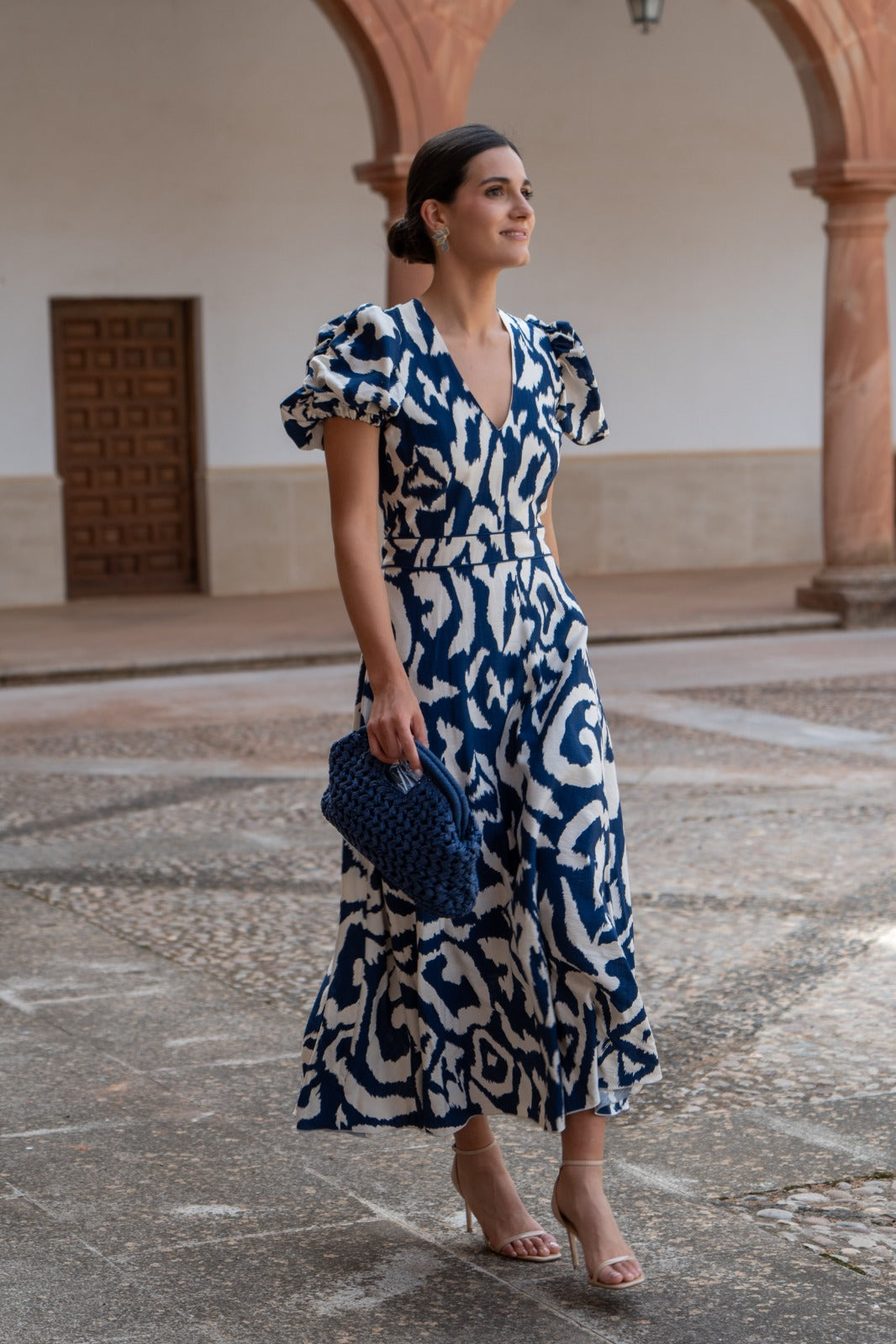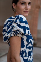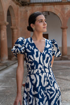 Vestido midi, escote a pico, manga corta abullonada, corte en cintura, vuelo abajo. Estampado azul y blanco.
