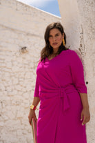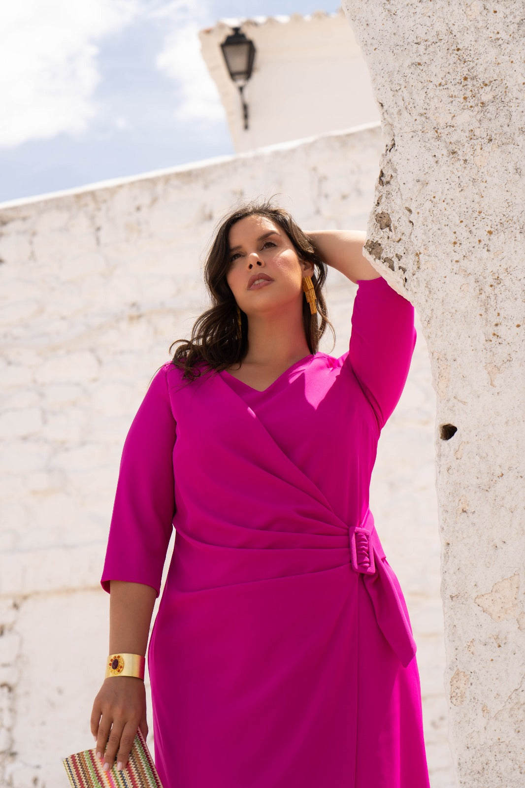Vestido fluido, escote a pico, manga francesa, recogido a un lado con hebilla. Em color rosa.