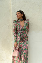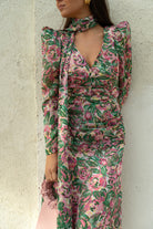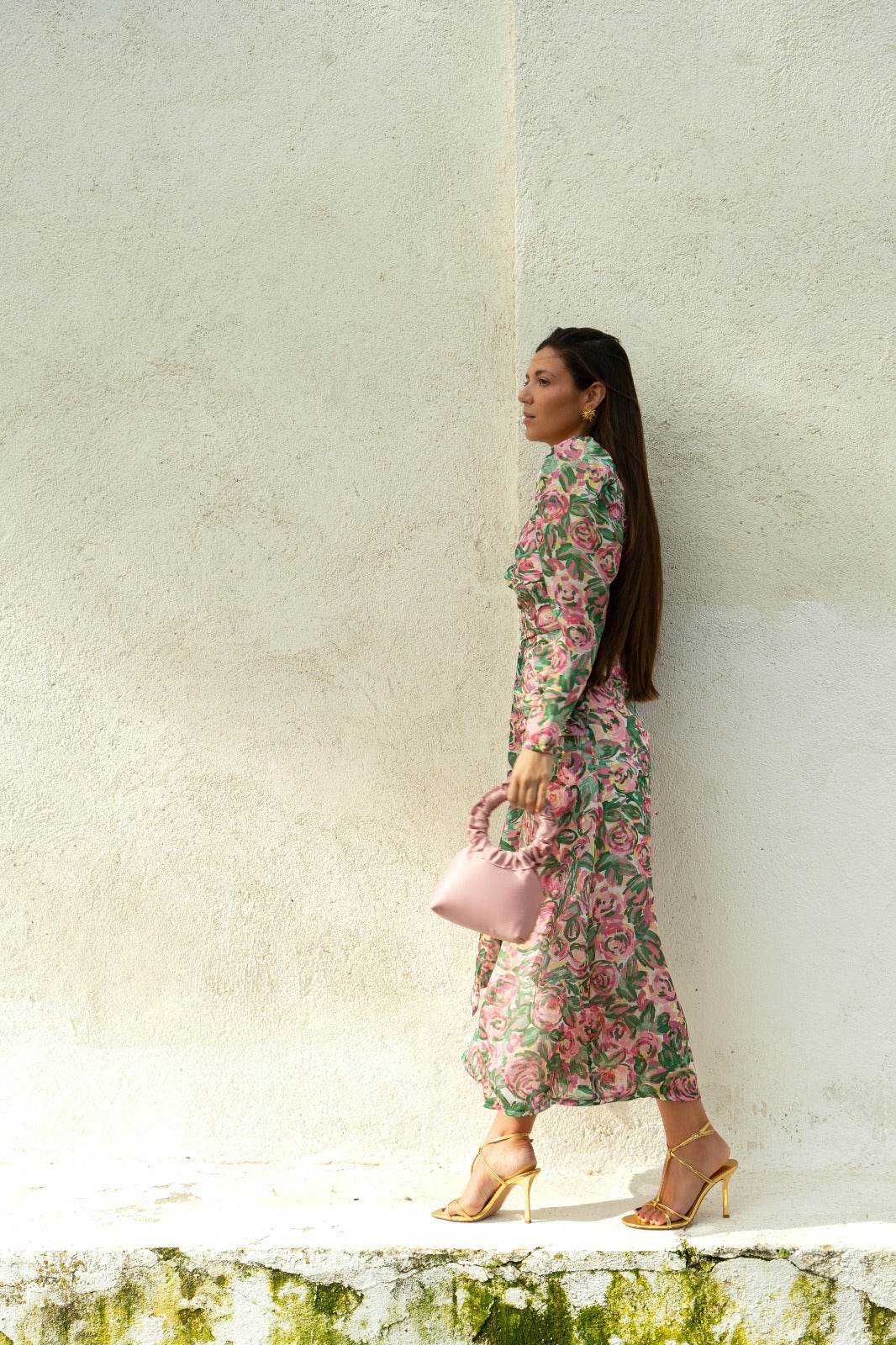 Vestido midi, escote a pico, manga larga hombrera alta, fruncido en el pecho, lazo para el cuello. En flores estampadas.
