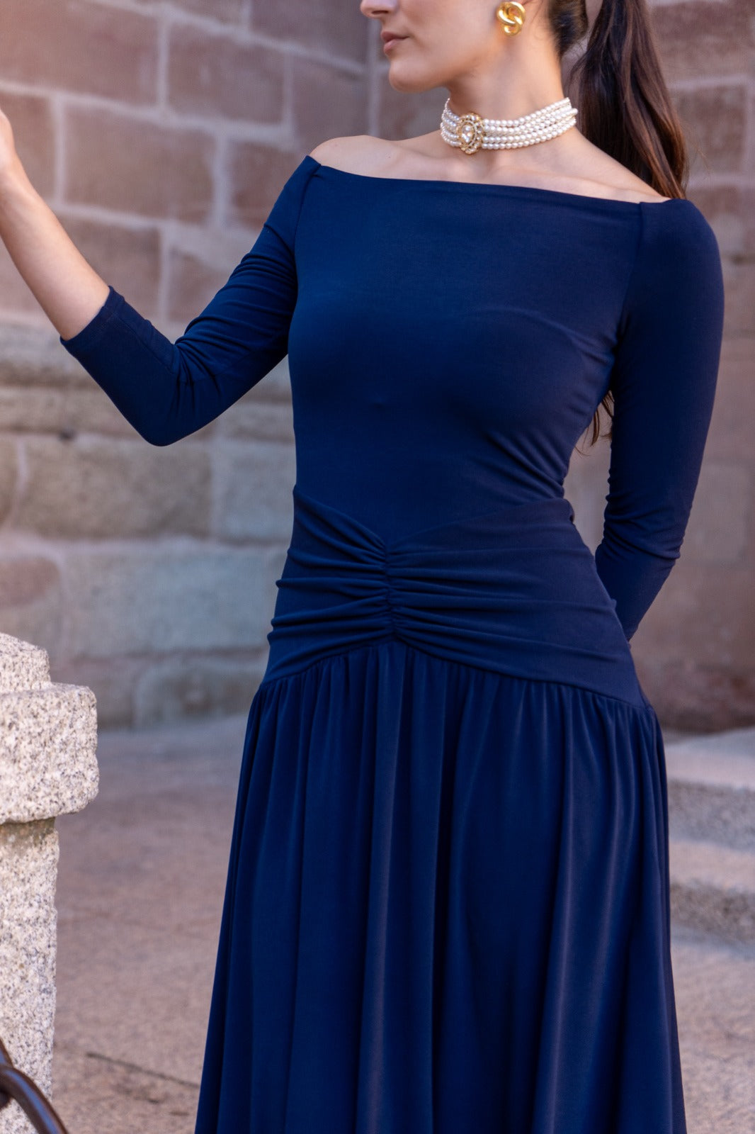 Vestido midi, escote bardot, manga francesa, fruncido en cintura, y falda fluida con vuelo. En punto seda color azul.