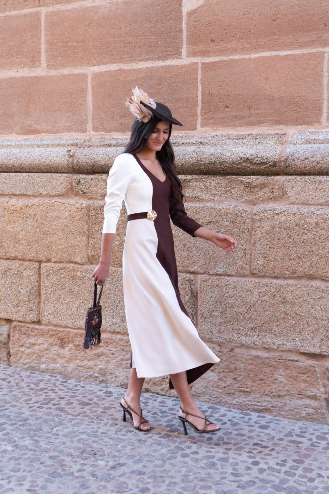 Vestido midi, escote pico, media manga, corte en cintura detalle dorado, evase, falda con movimiento. Bicolor beige y marrón.