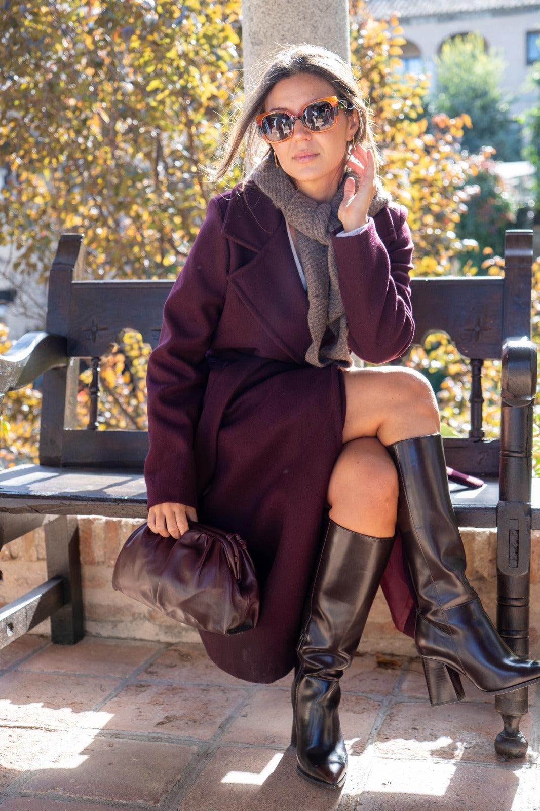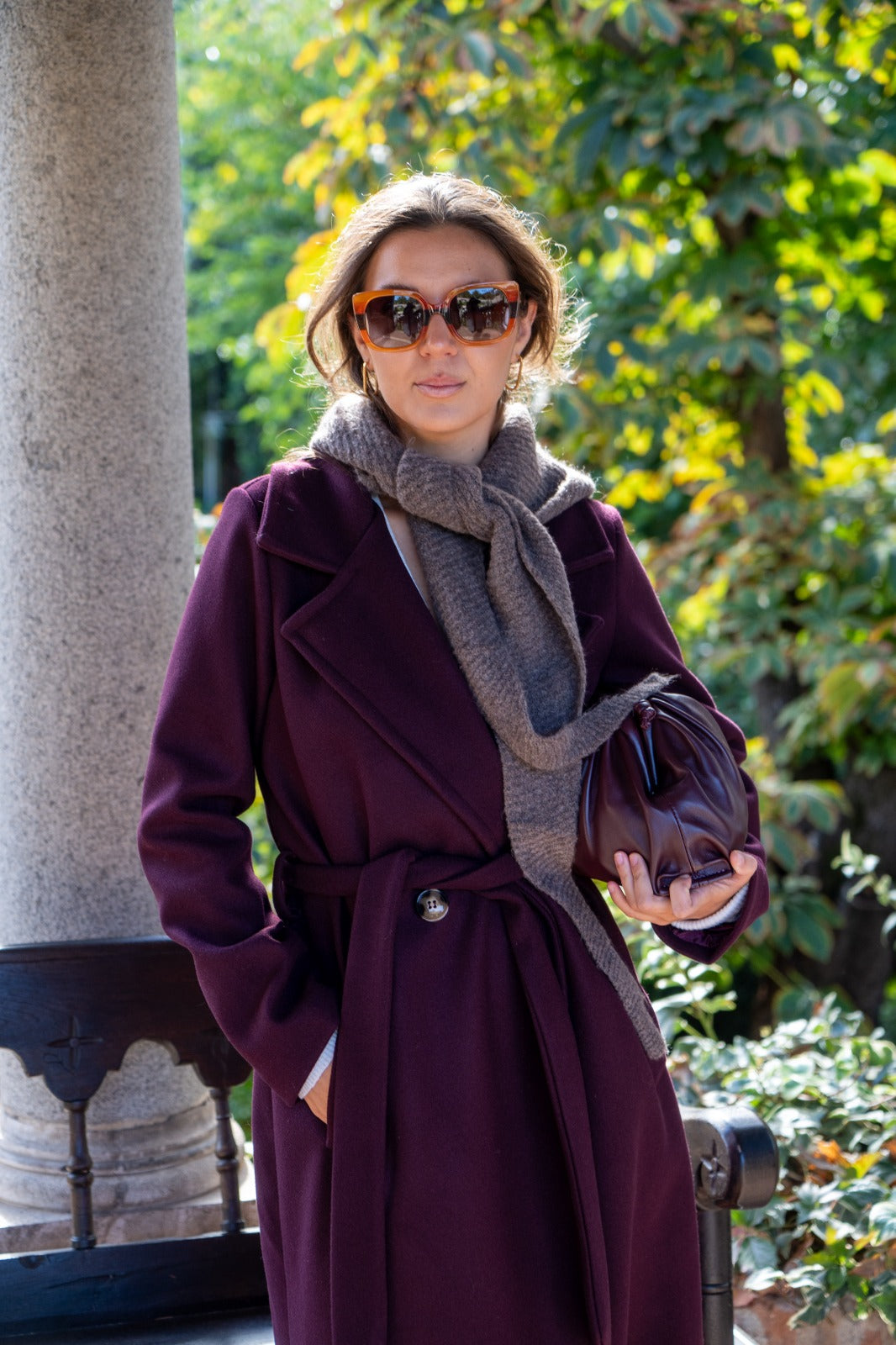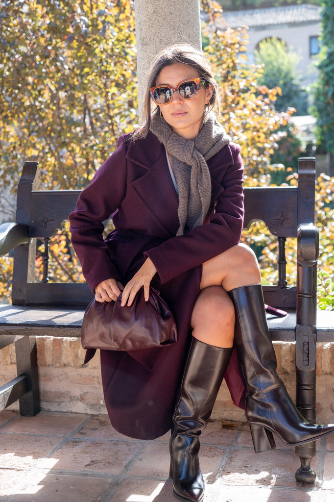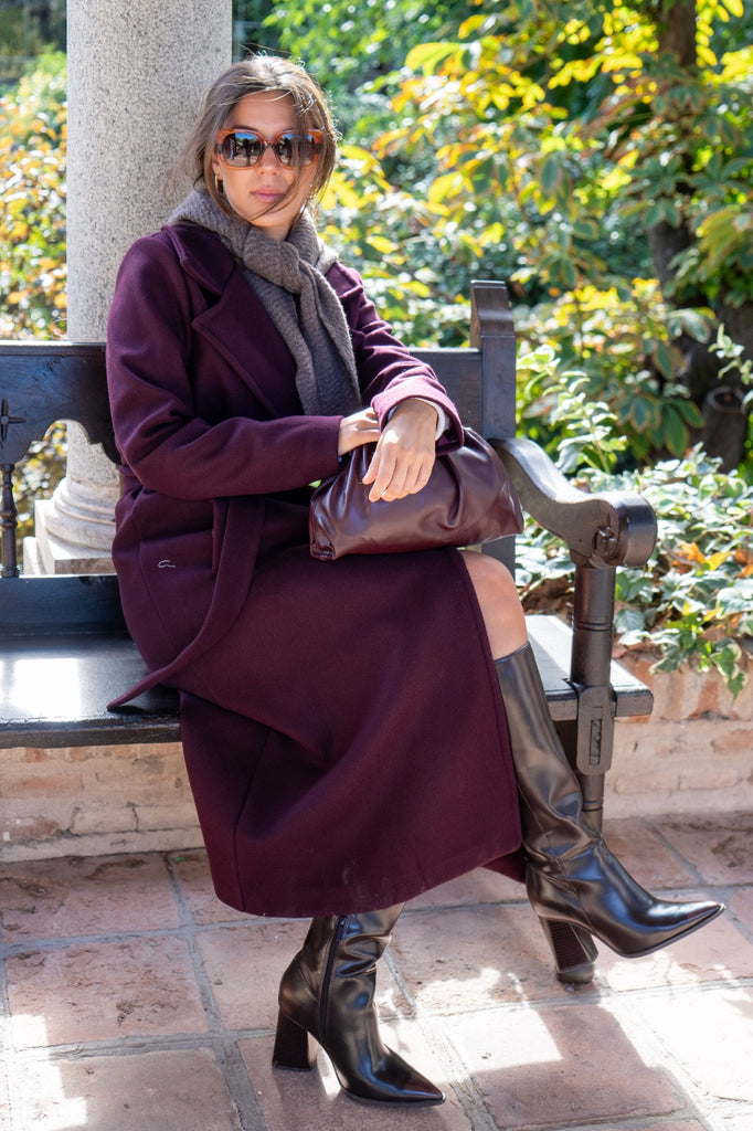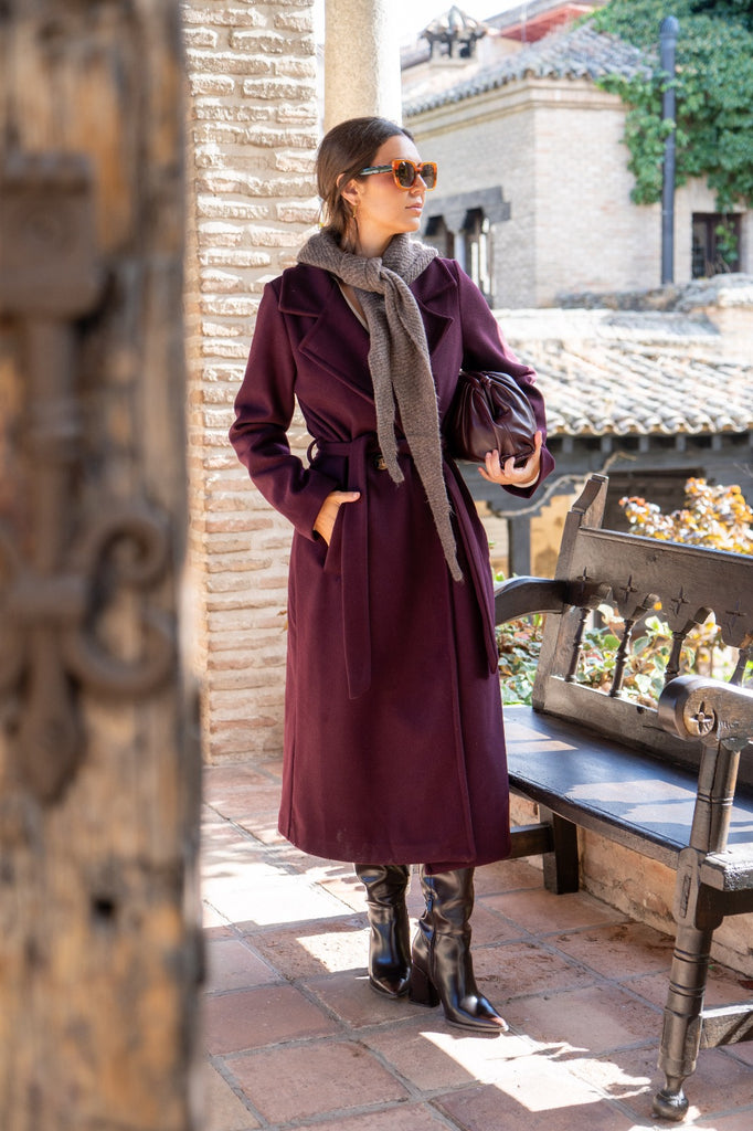 Long, wool-type coat, warm, with a lapel collar, side pockets, and a belt. In aubergine color.