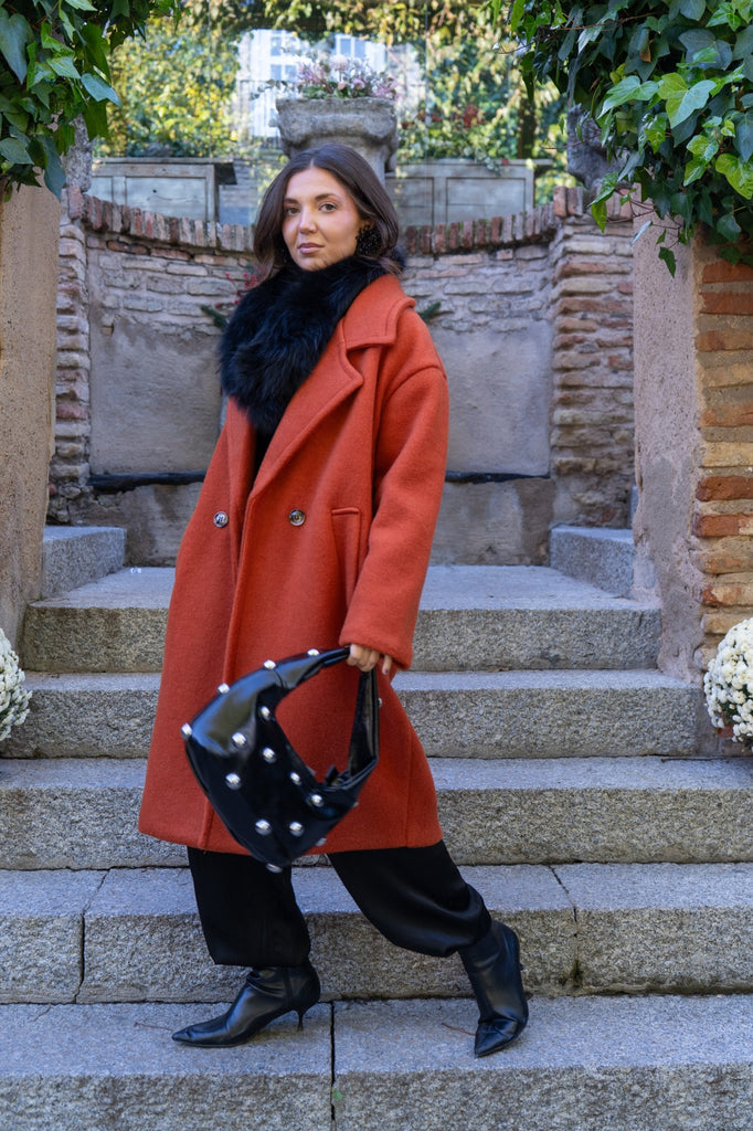 Abrigo tipo paño, calentito, cuello solapa, bolsillos laterales, cruzado con botones. En color naranja.