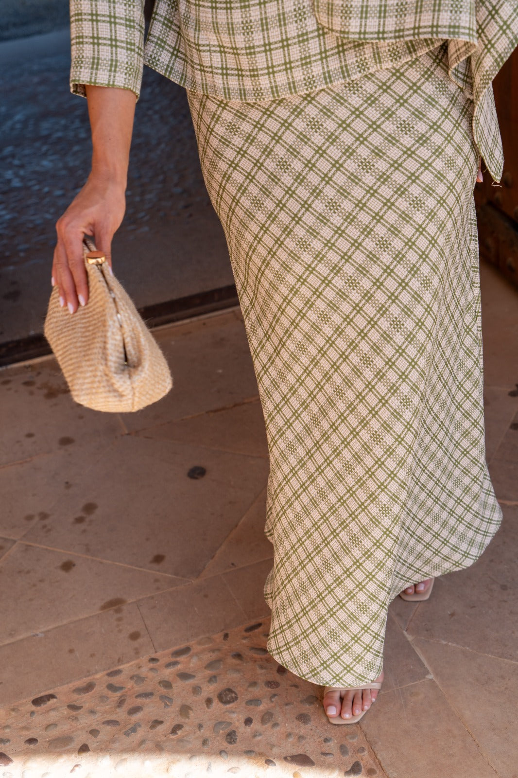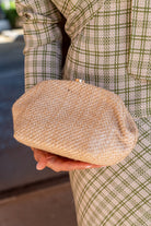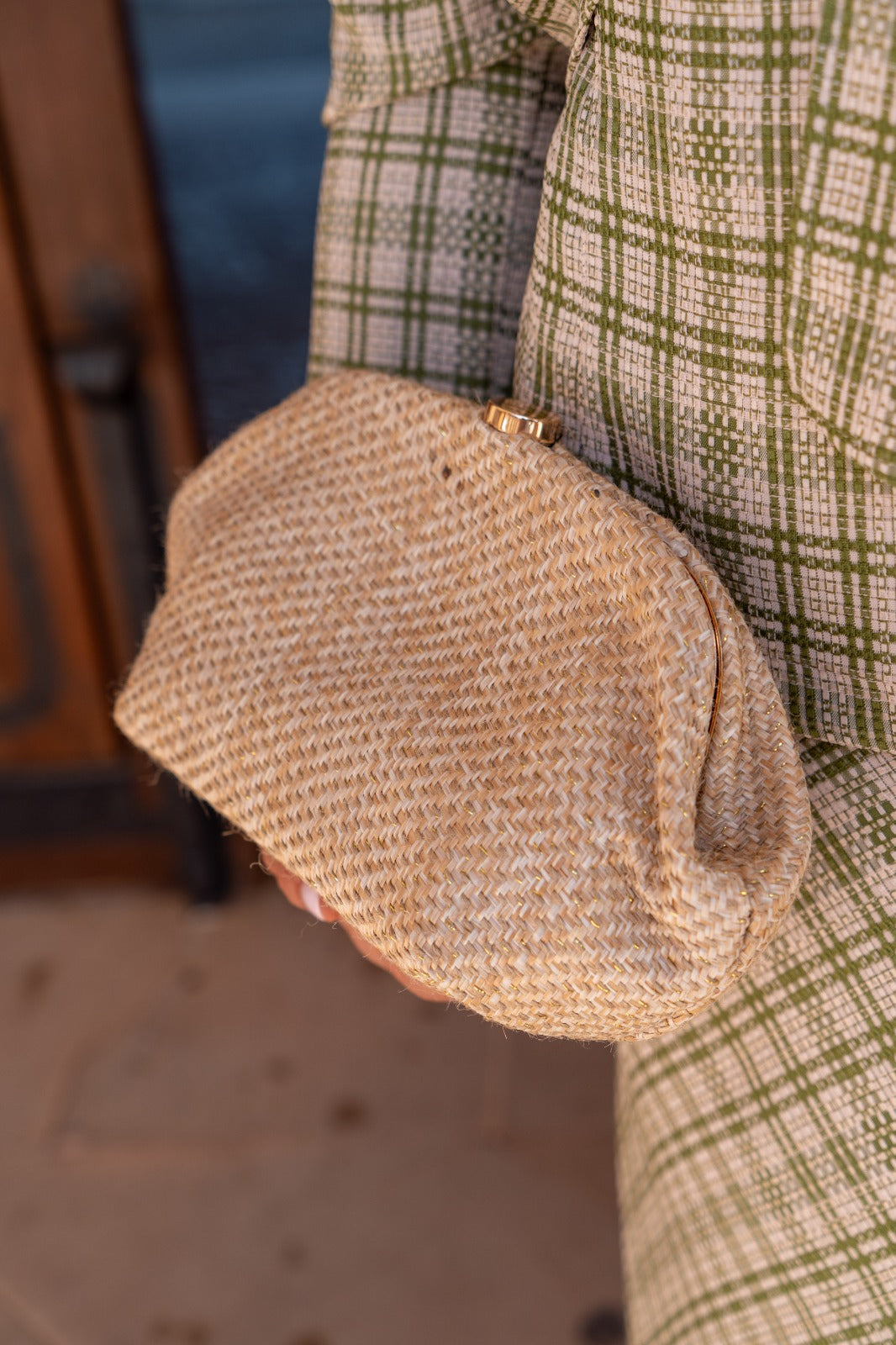 Rattan-style bag, magnetic closure, gold chain strap. In beige.