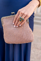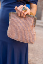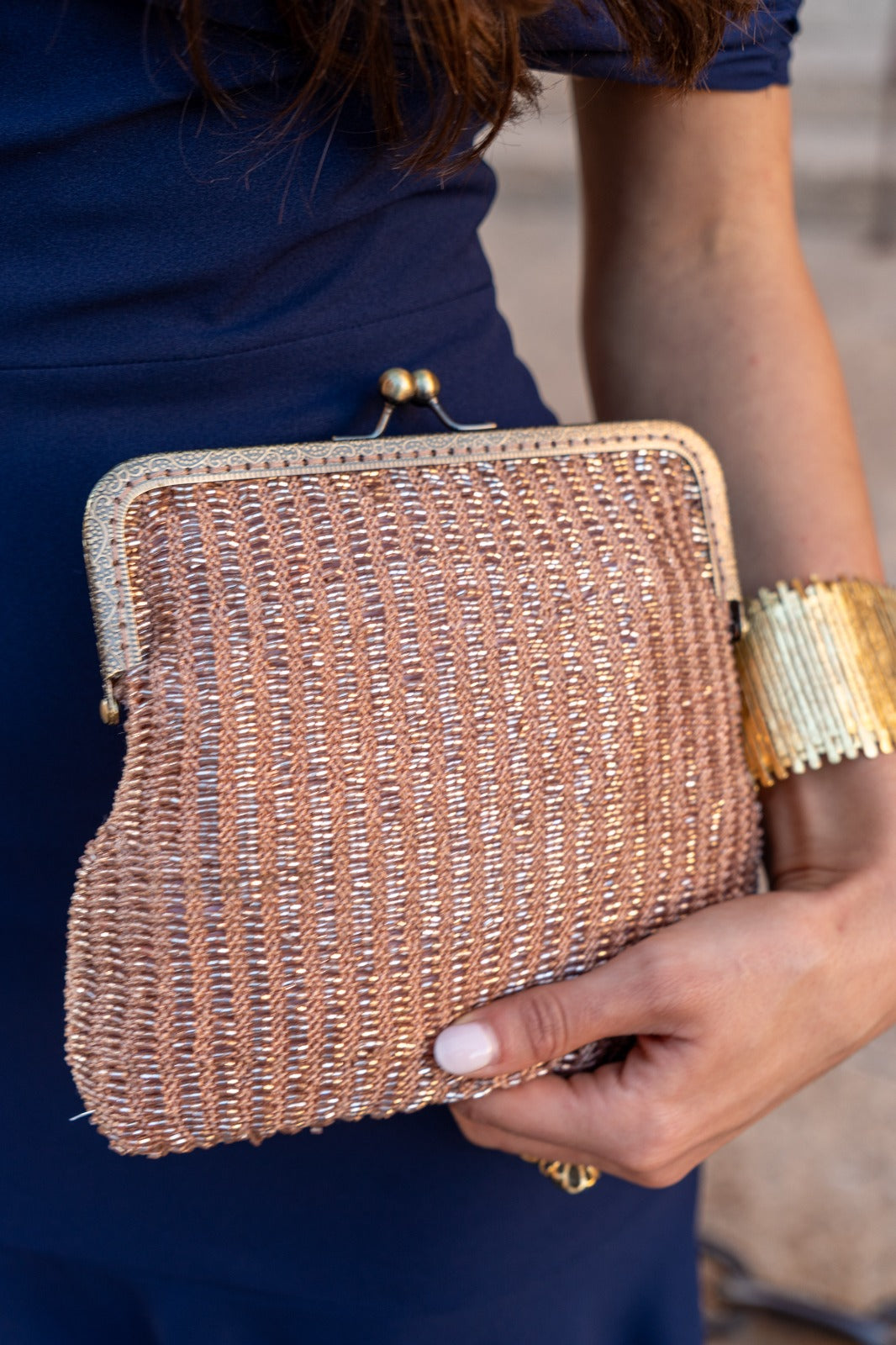Gold crossbody bag, with chain and makeup-colored beads.