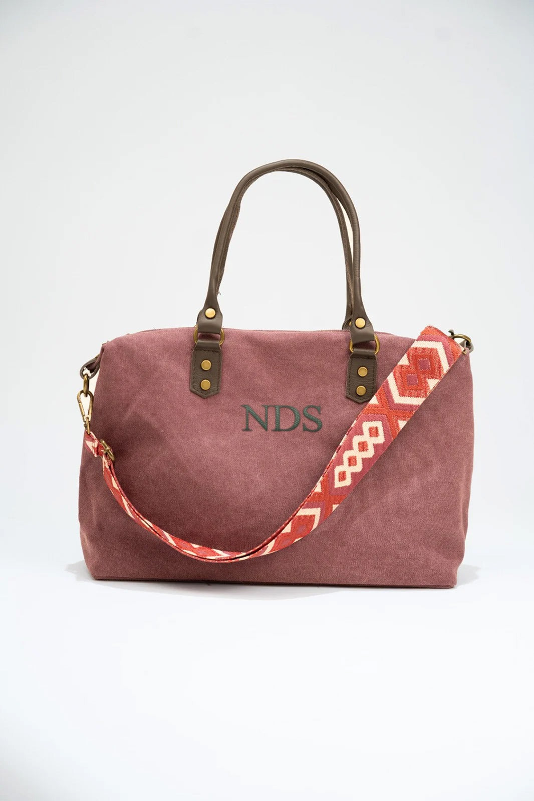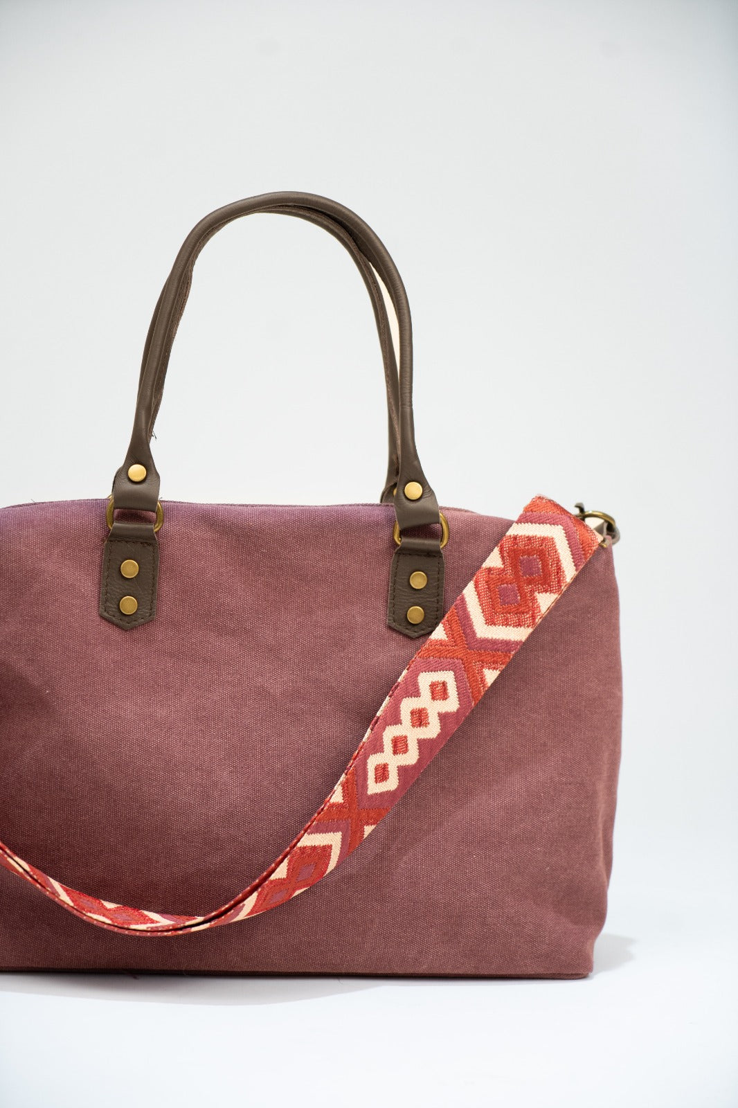 Canvas handbag with fixed leather handles and a removable, adjustable chocolate brown cotton strap. Zip closure, black lining, and interior pocket. Burgundy color.
