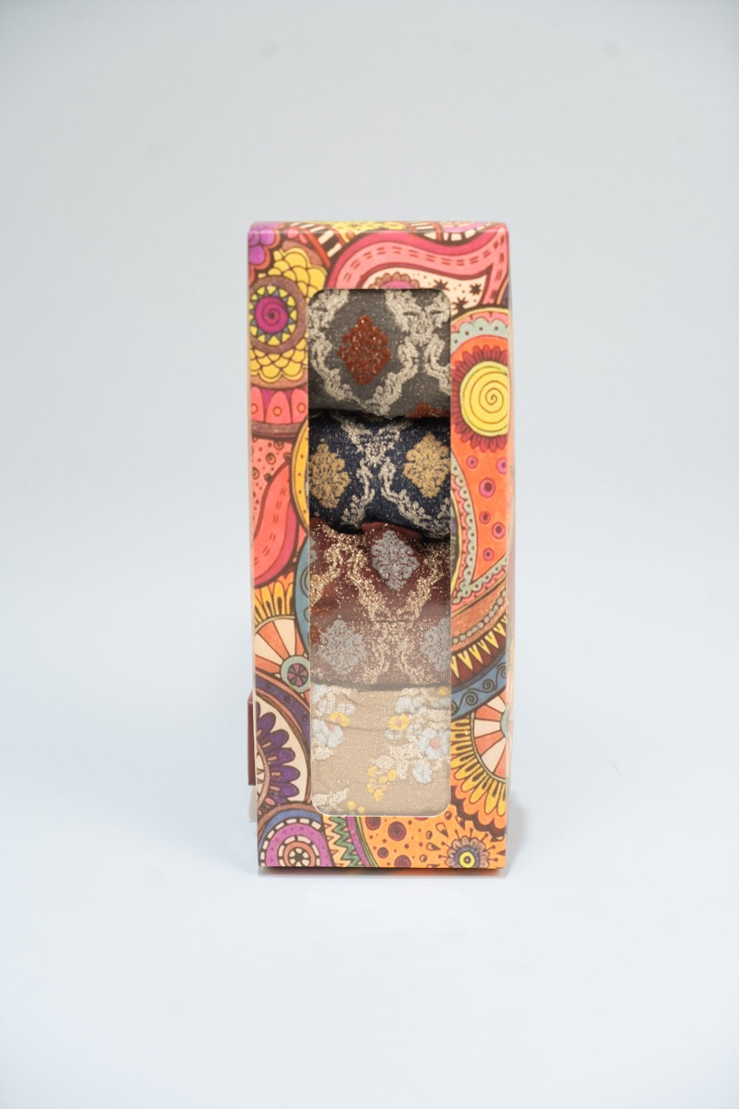 Pack of 4 socks with assorted prints and colors, size 34-38. Presented in a box.