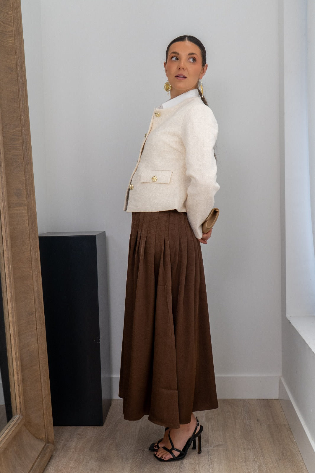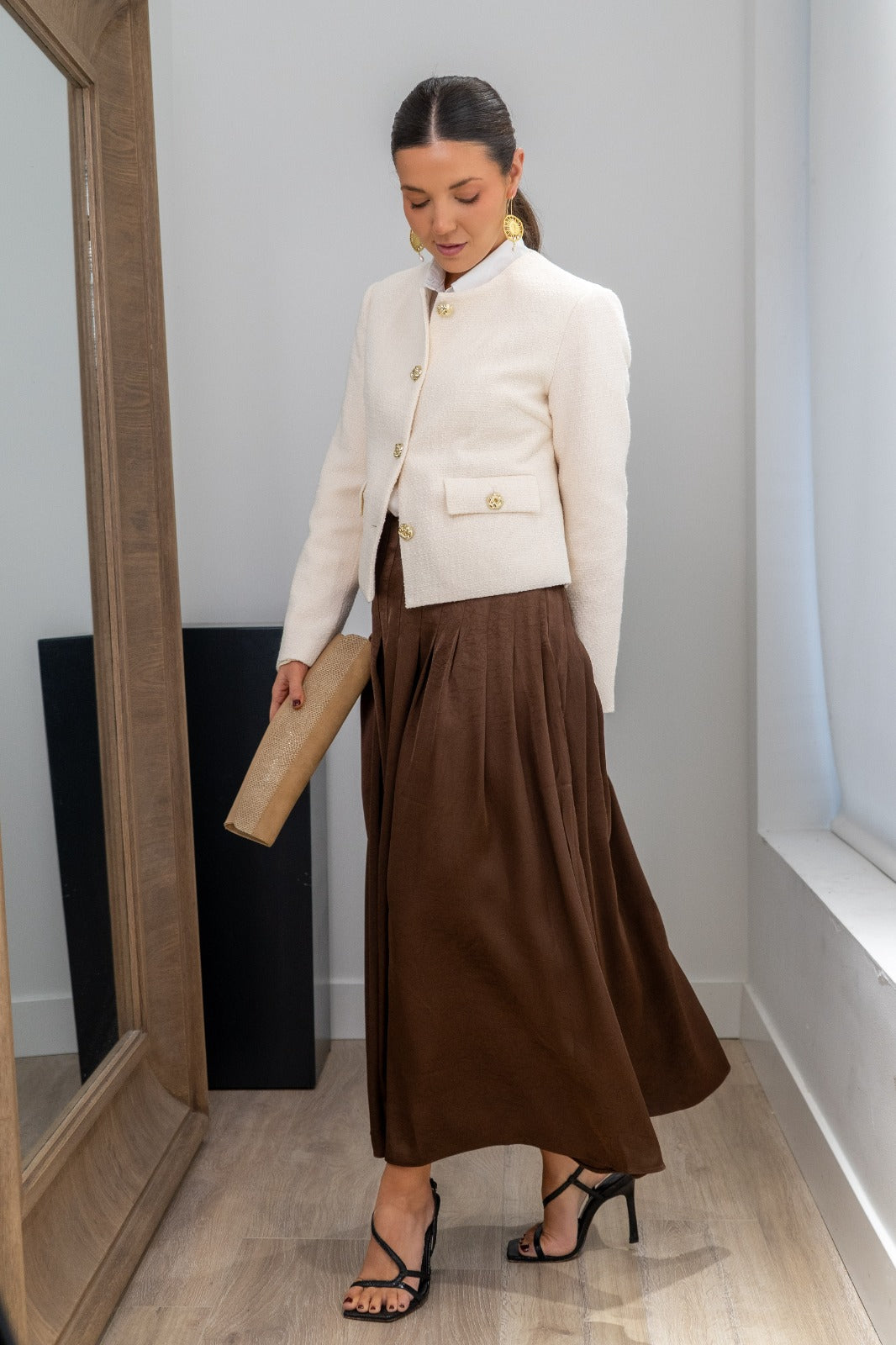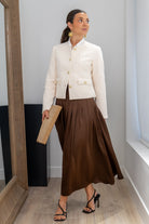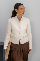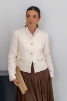 Chaqueta cuello mao, abotonada, tapetas delanteras, manga larga. En color beige.
