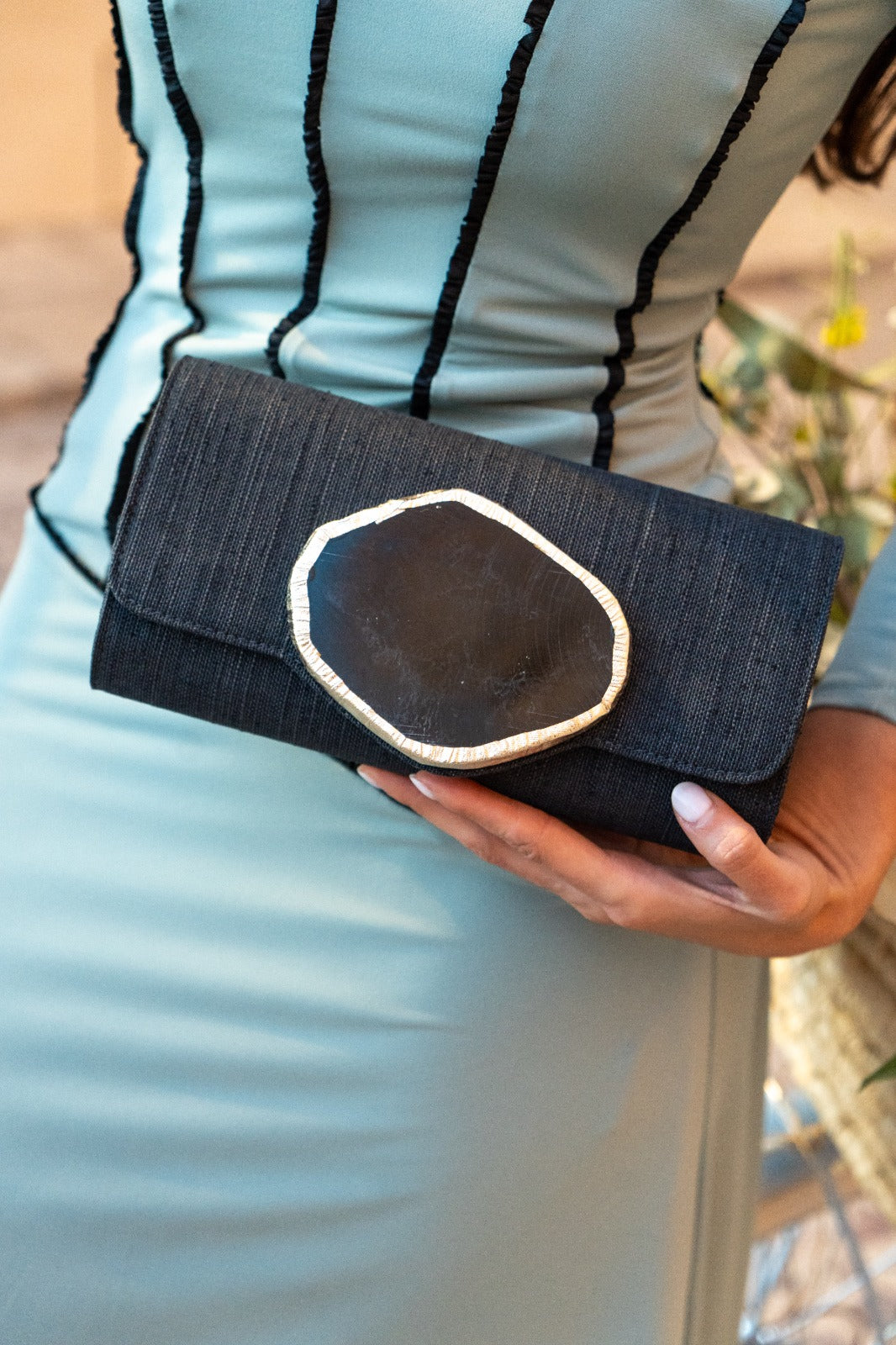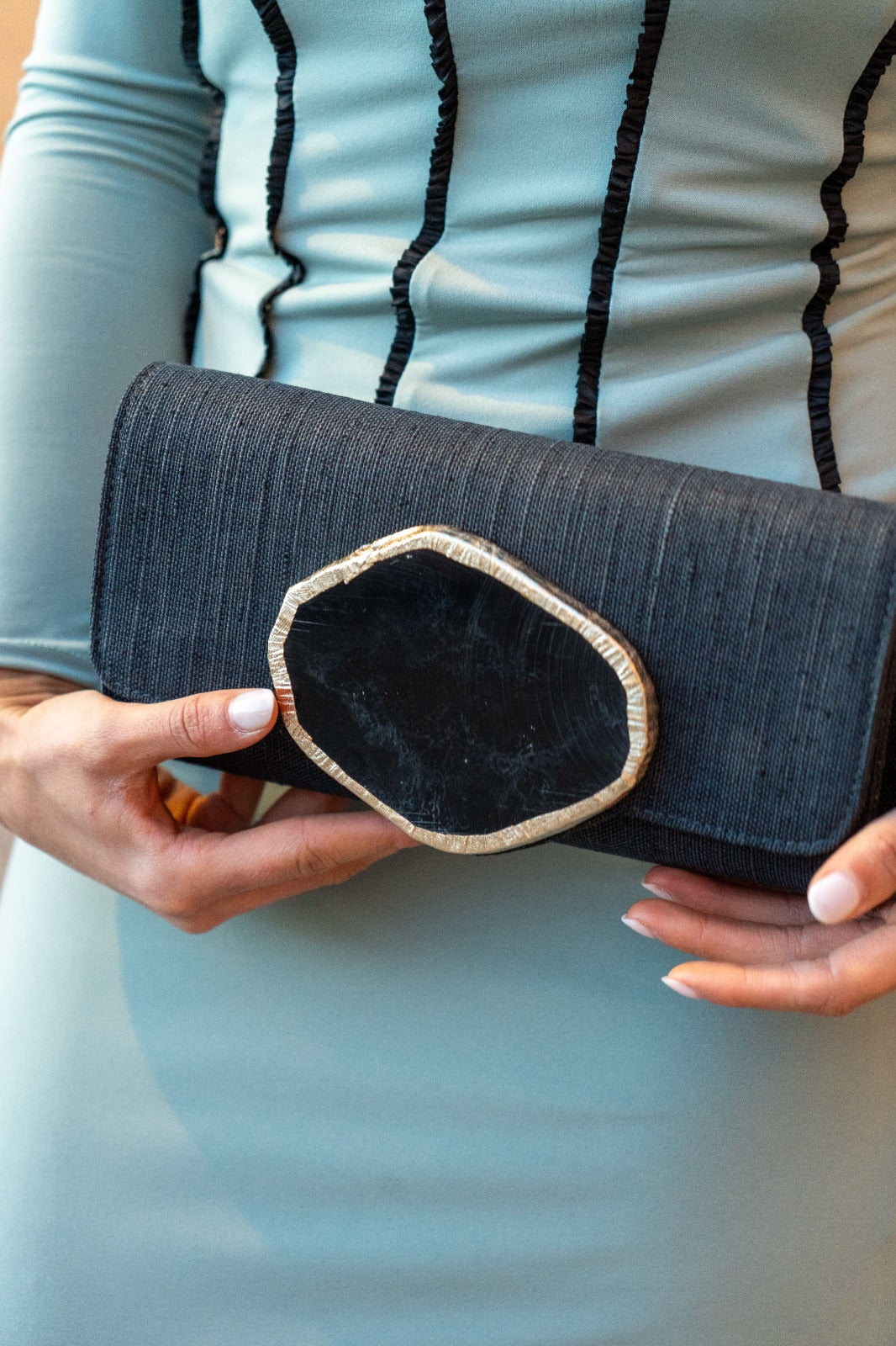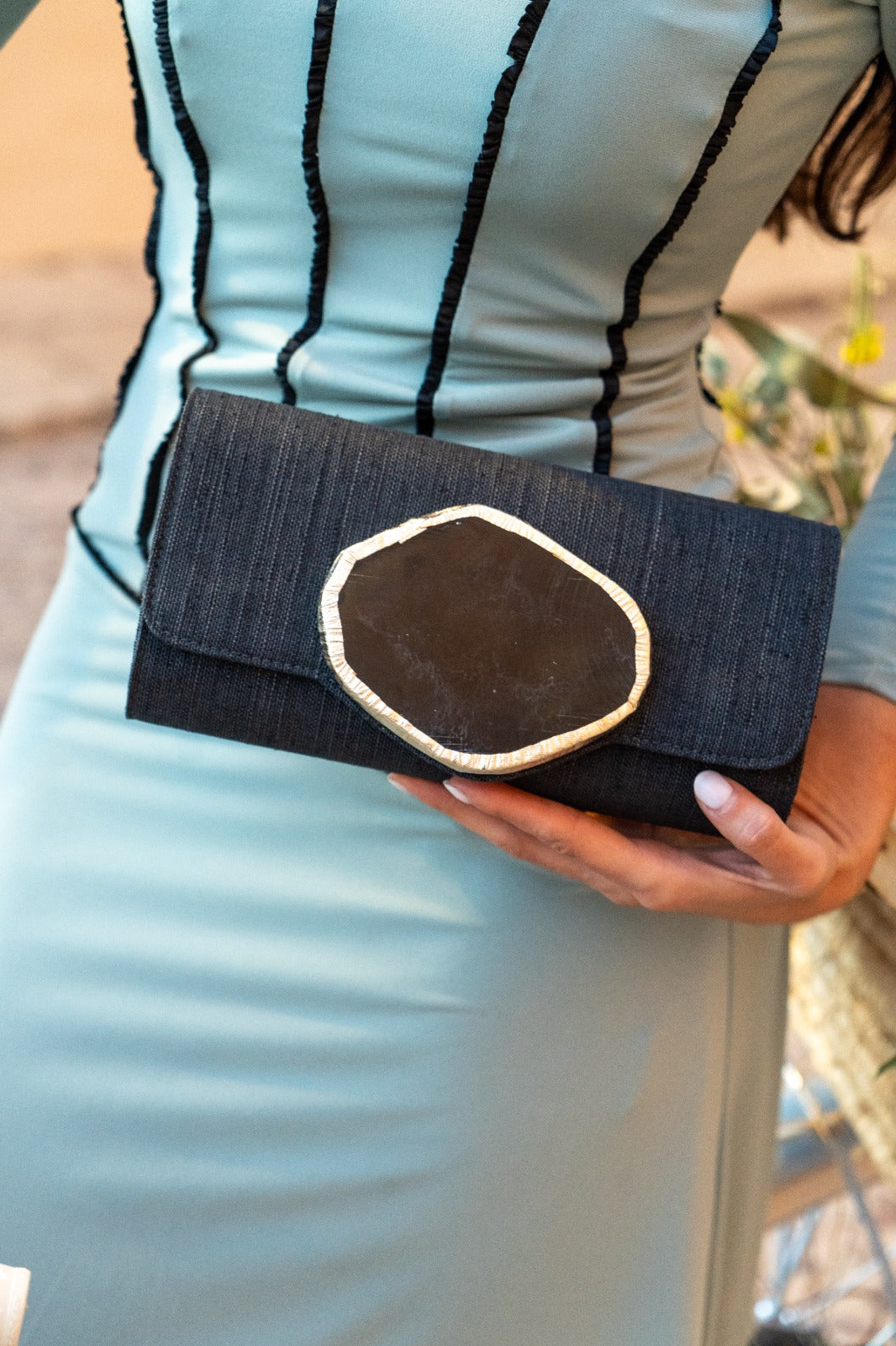 Bolso alargado, en tejido rugoso, detalle de piedra en el centro, cierre con imán, cadena dorada para colgar. En color negro.